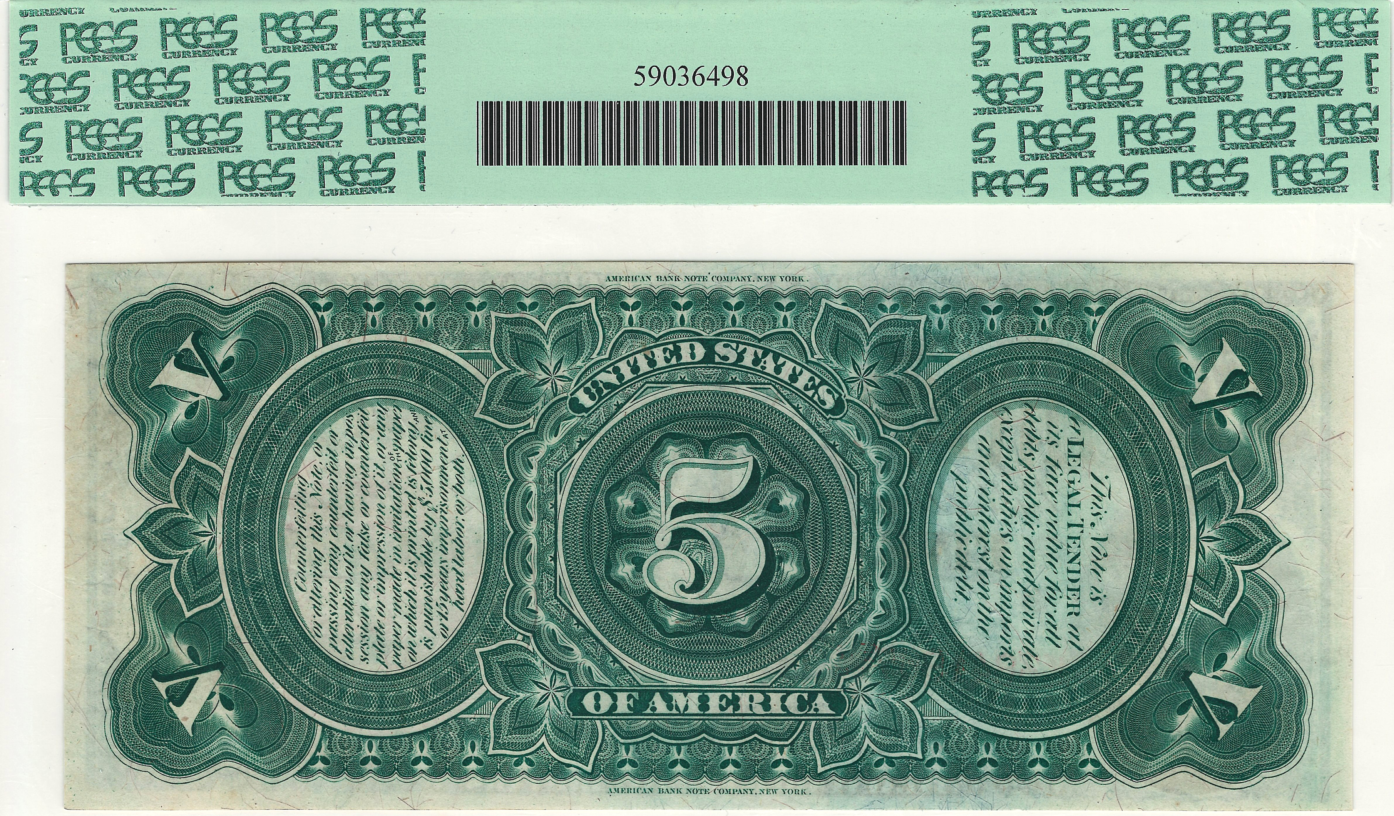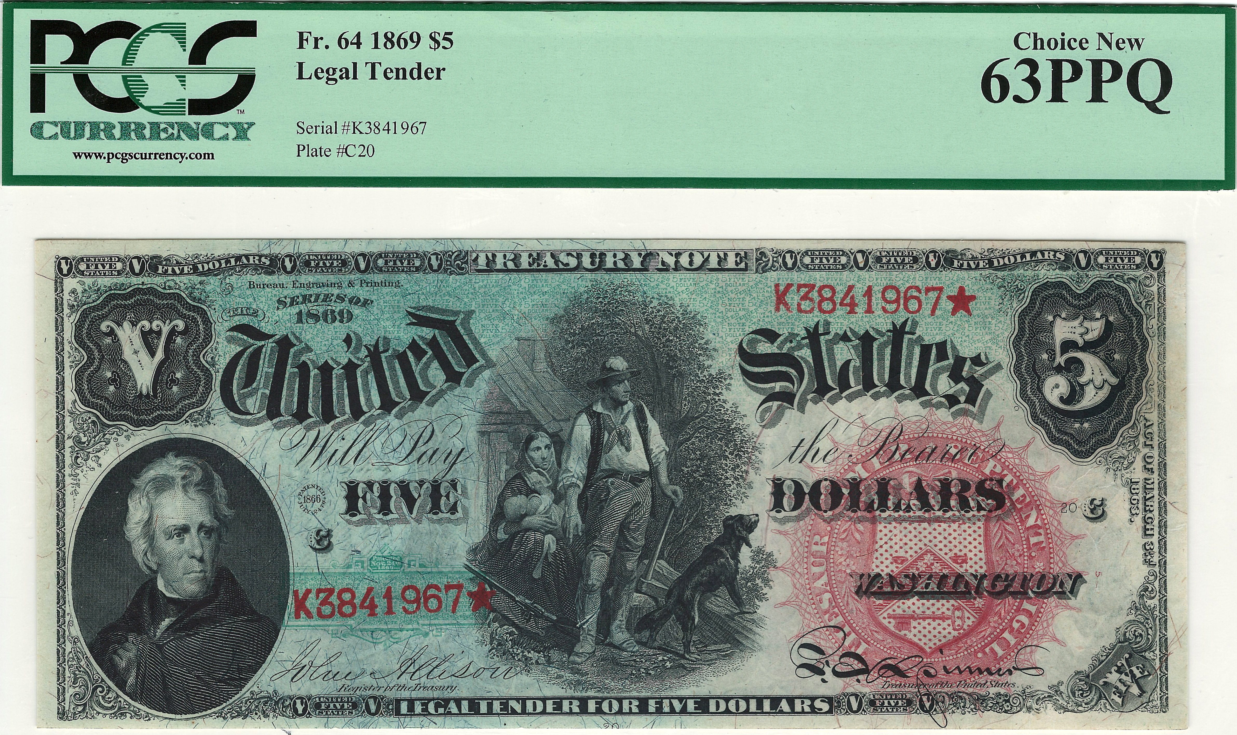 This is a 1869 $5 Legal Tender or commonly referred to as a Rainbow or Pioneer note. It features Andrew Jackson the seventh President of the US from 1829 to 1833. At the center is s painting of the Pioneer Family and engraved by Alfred Henry Gugler. All of the 1869 Legal Tenders are referred to as Rainbow Notes because of their beautiful and vibrant colors across the front. This is a totally Uncirculated note with no problems of any kind. The top margin at the right keep this from a GEM note. It also features the thick dark red serial numbers with a star following at the end for which Rainbow notes are famous for and the large red spiked seal to the right. Although there is a star after the serial number, it is NOT a star note or replacement note. Those were not introduced until around 1910. This is a beautiful example and would make a real nice addition to anyone's high end collection. The serial number is K3841967 and is in a PCGS-63PPQ holder. For you birthday collectors, anyone born in 1967?