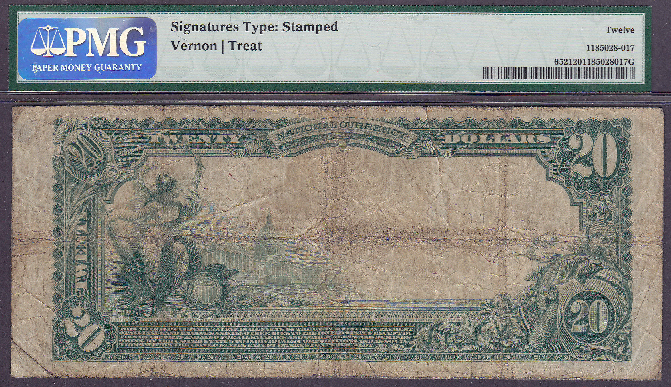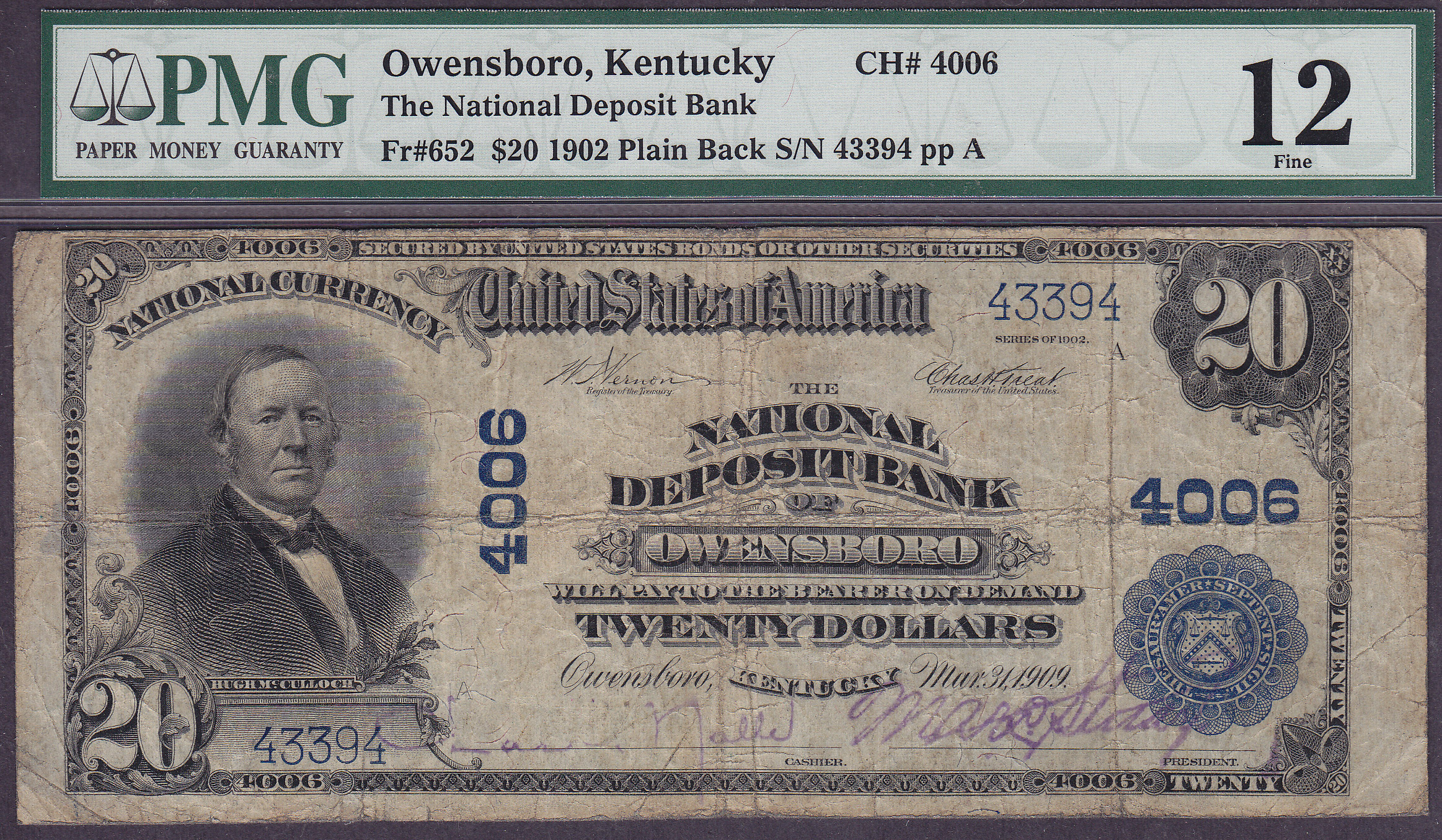 Here is a 1902 $20 Plain back from the First National Deposit bank of Owensboro, Kentucky. The serial # is 43394 and the charter number is 4006. It is in a PMG Fine-12 holder. There are only nine of these 1902 $20 Plain Backs known from this bank.
