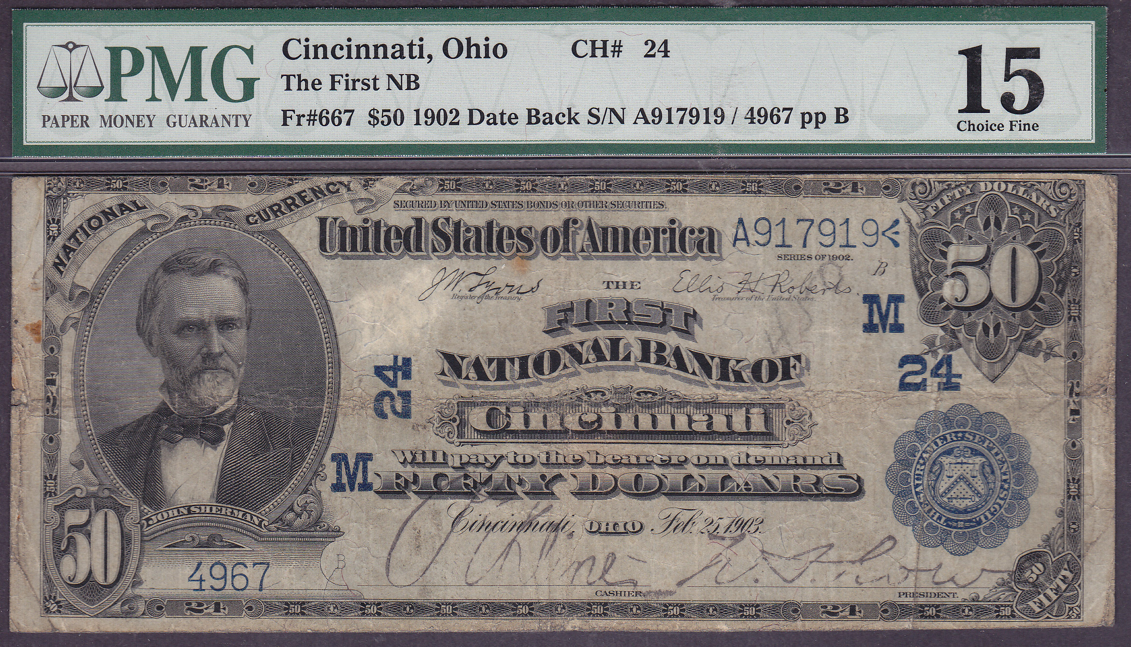Here is a 1902 $50 Date Back from the First National Bank of Cincinatti, Ohio. The serial number is 4967 and the charter is SUPER LOW # 24. It is in a PMG-15 holder. There are 14 known from this bank.