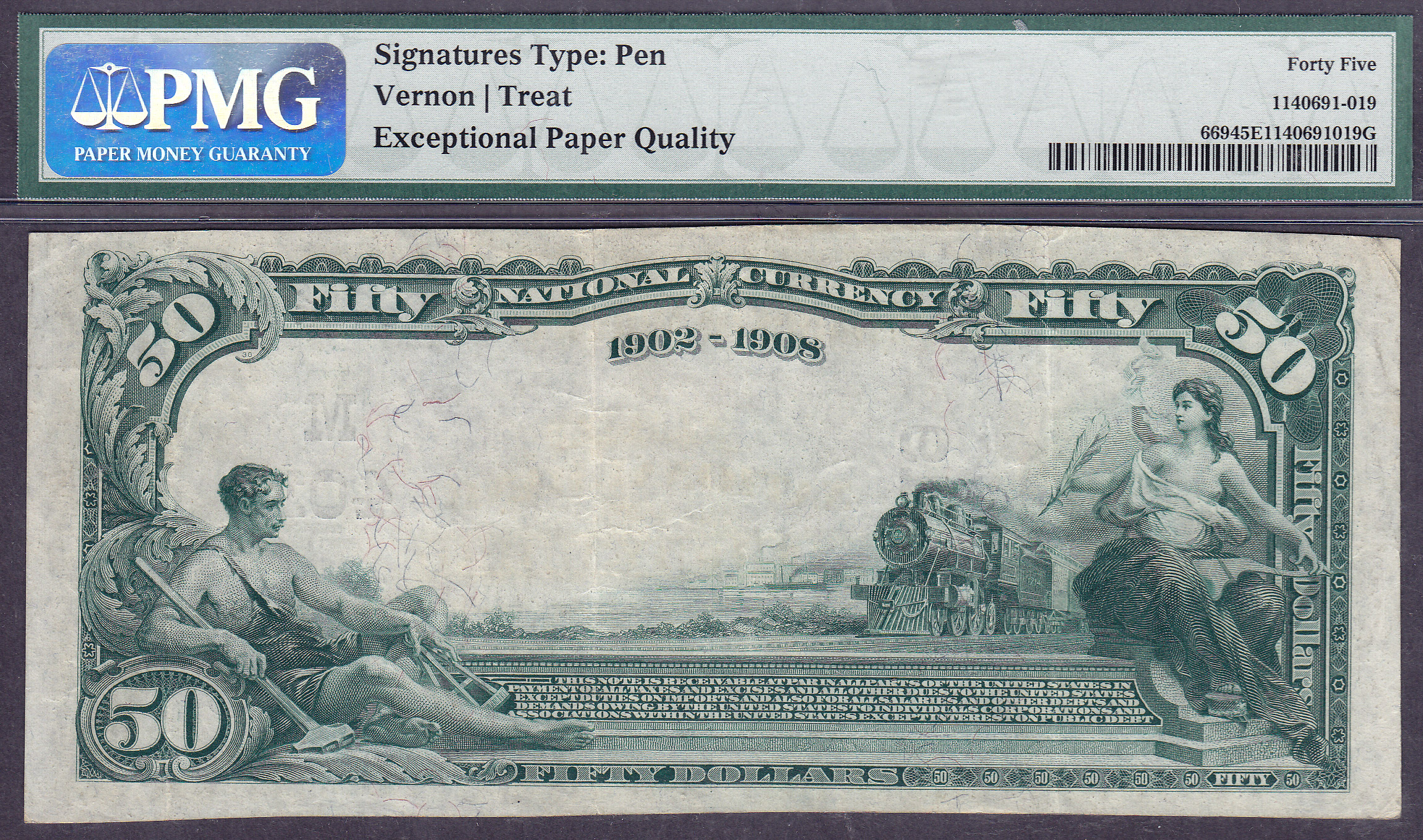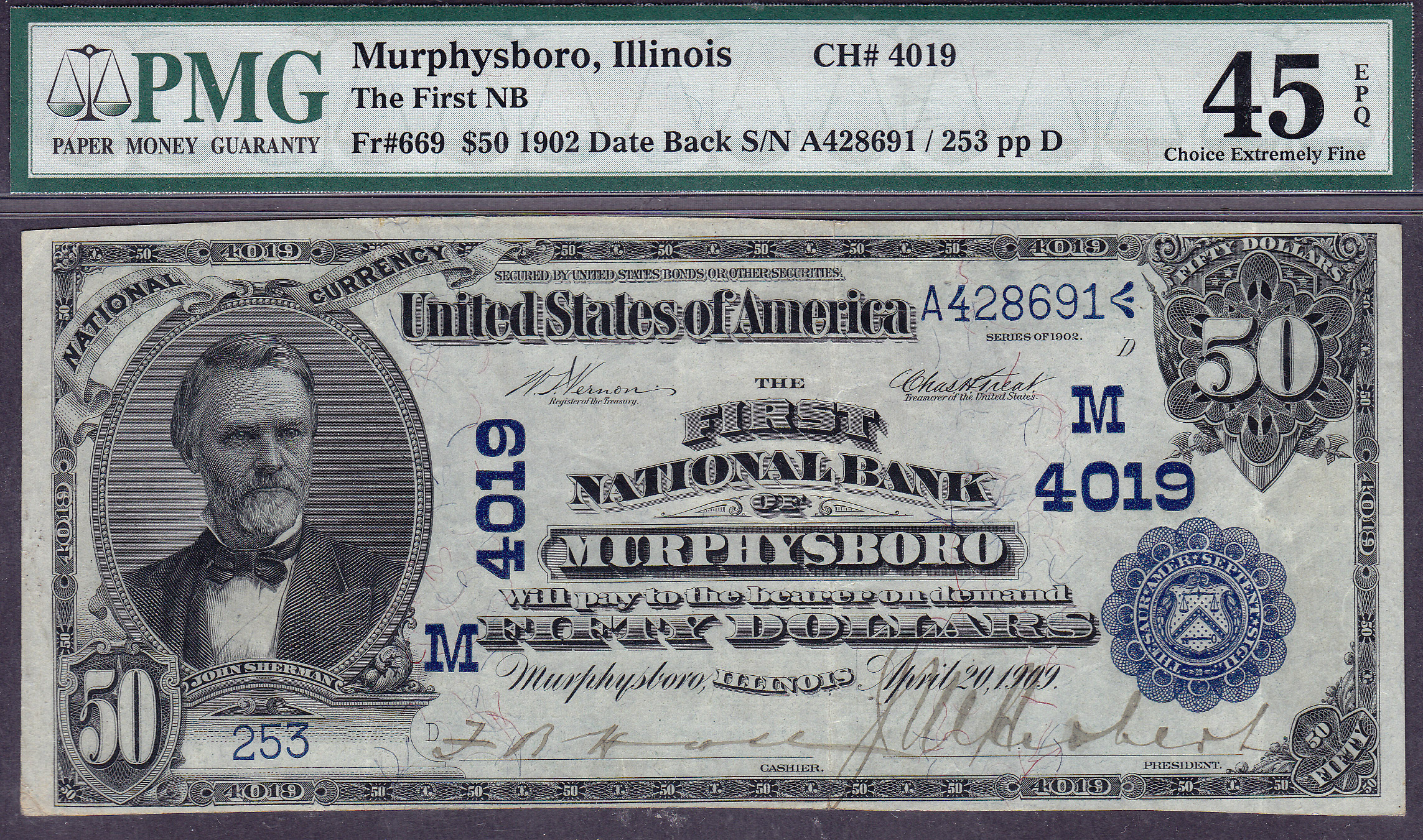 This 1902 $50 National Bank Note from the First National Bank of Murphysboro, Il and is graded as a PMG EF-45EPQ with serial # 253. It features strong signatures, sharp color and crackling fresh paper quality. The last sale of this type note was on 5/12/2004 in NY and it was a VF-40.