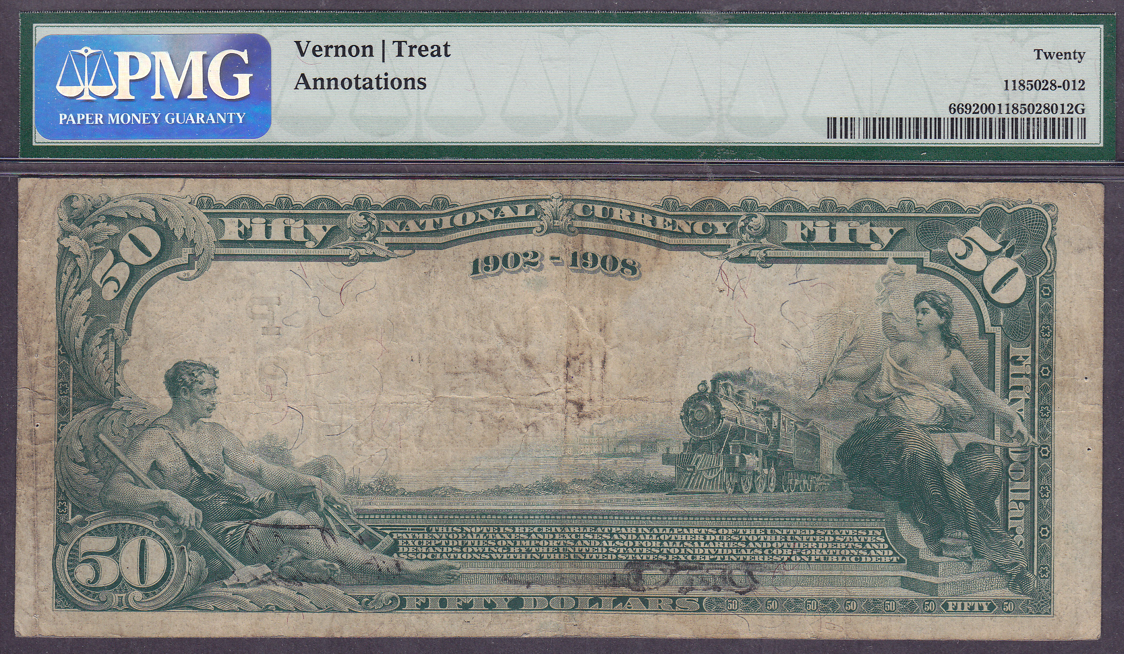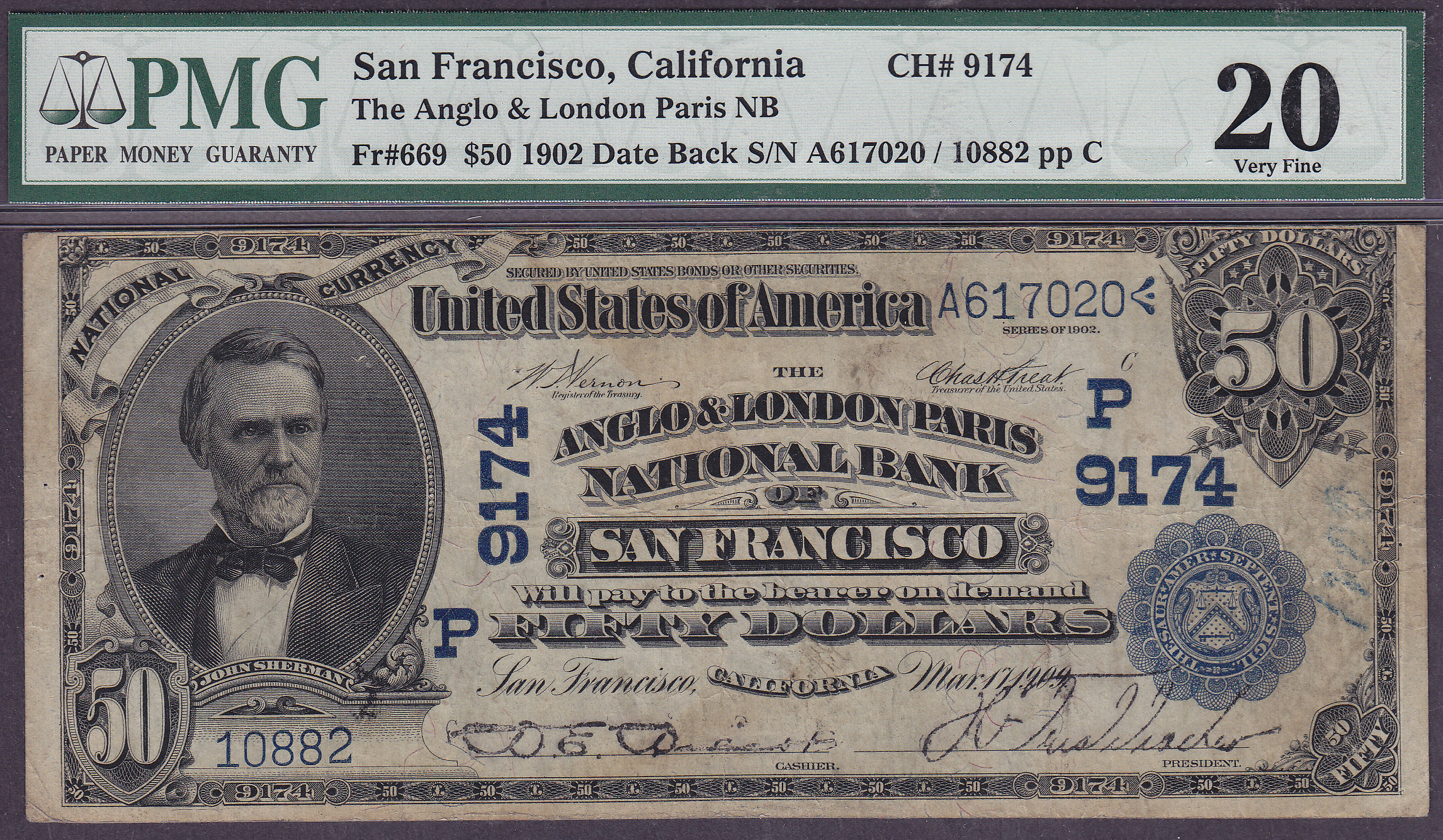 Here is a nice example of a 1902 $50 Date Back from The Anglo & London Paris National Bank of San Francisco, Calif. The charter is # 9174 and the bank serial number is 10882. It is in a PMG Vf-20 holder. There are only 14 of these 1902 $50's known from this bank.