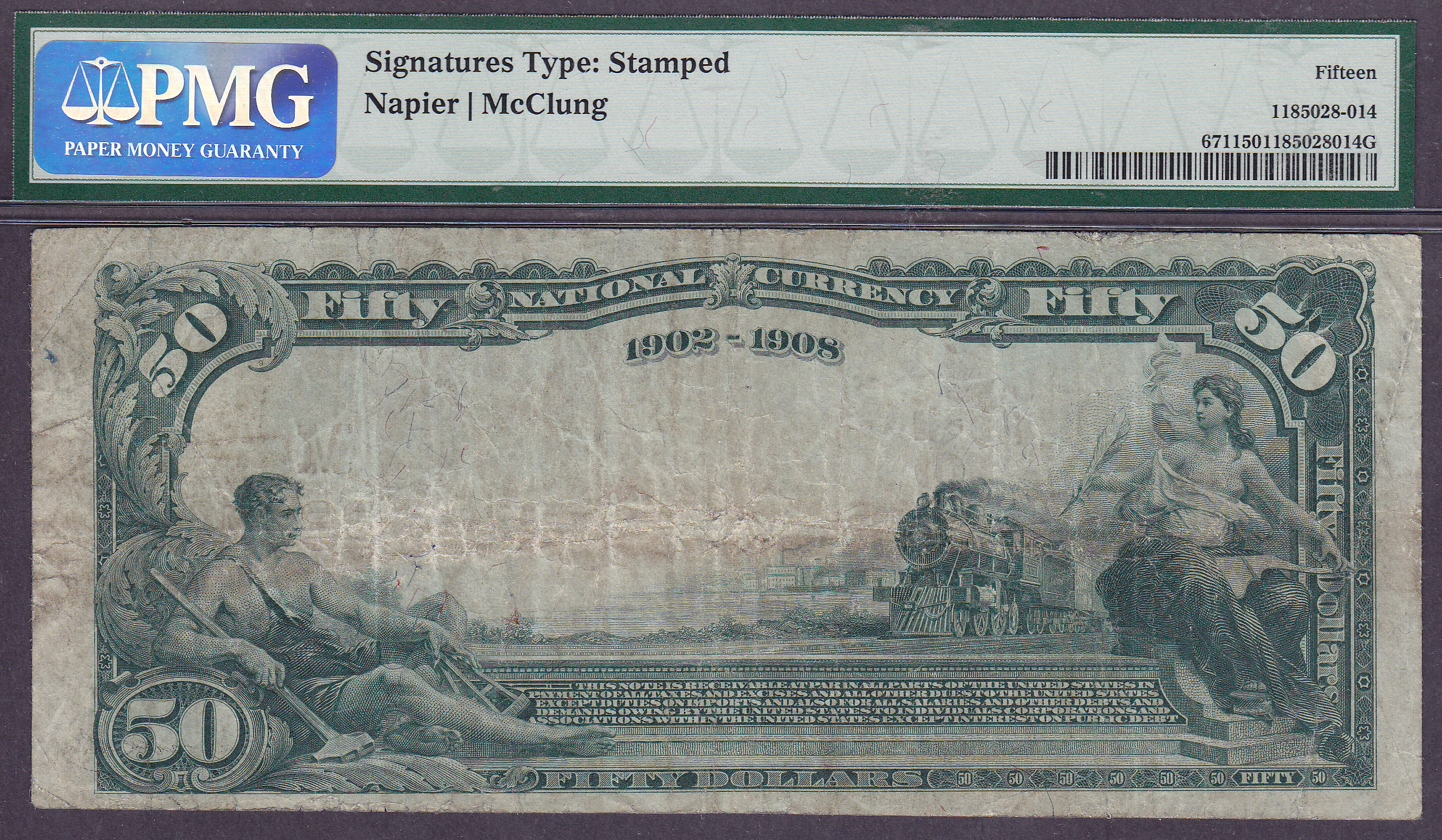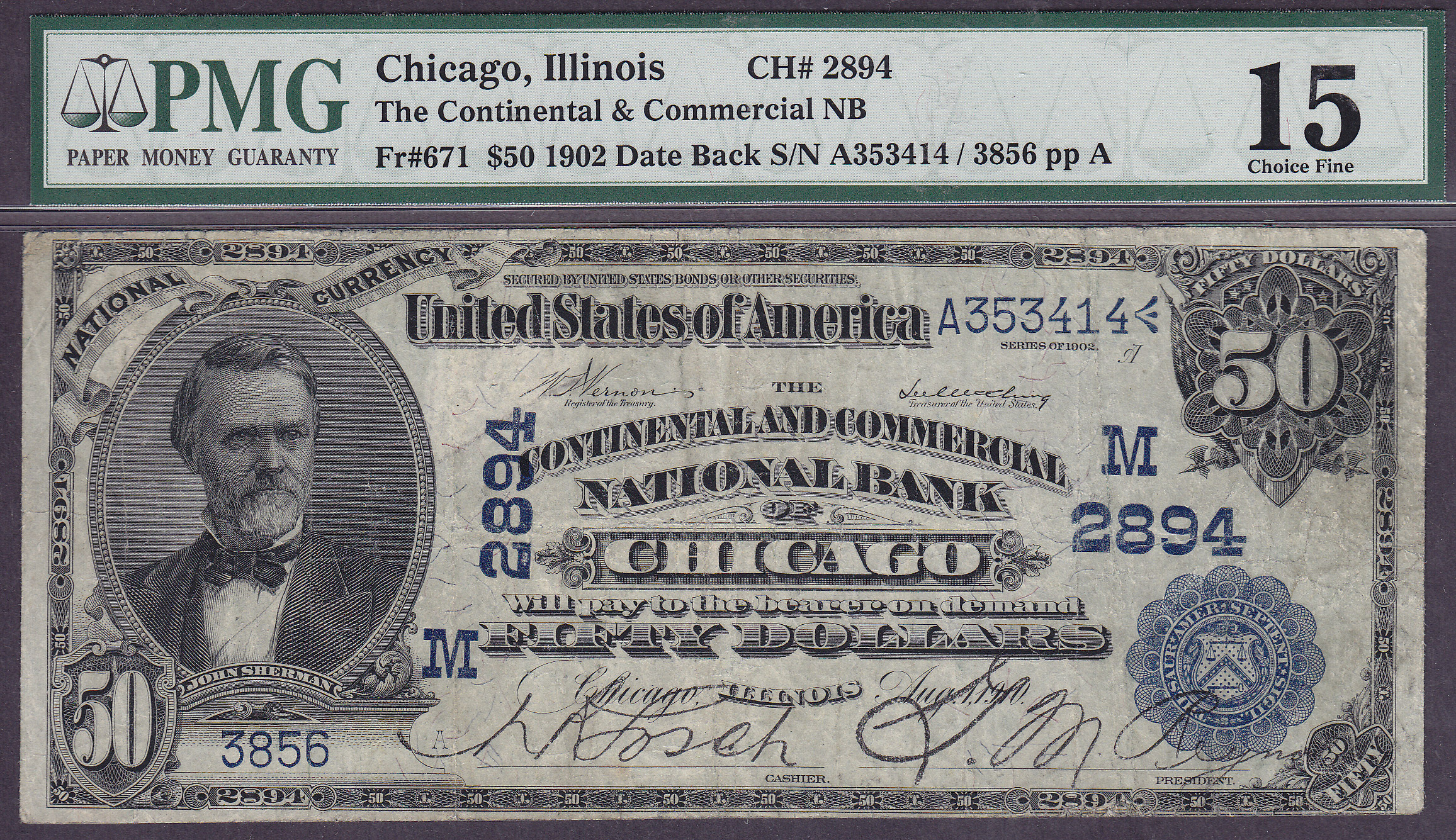 Here is a rare (6 known) 1902 $50 Date Back from the Continental and Commercial National bank of Chicago, Ill. The charter # is 2894 and the bank serial number is 3856. It has hand stamped signatures and is in a PMG F-15 holder. There are only six of these 1902 $50 Date Backs known from this bank.