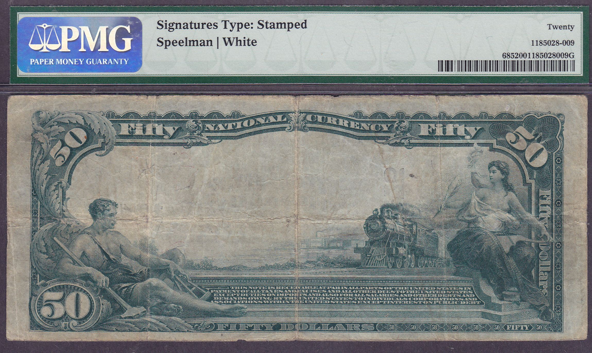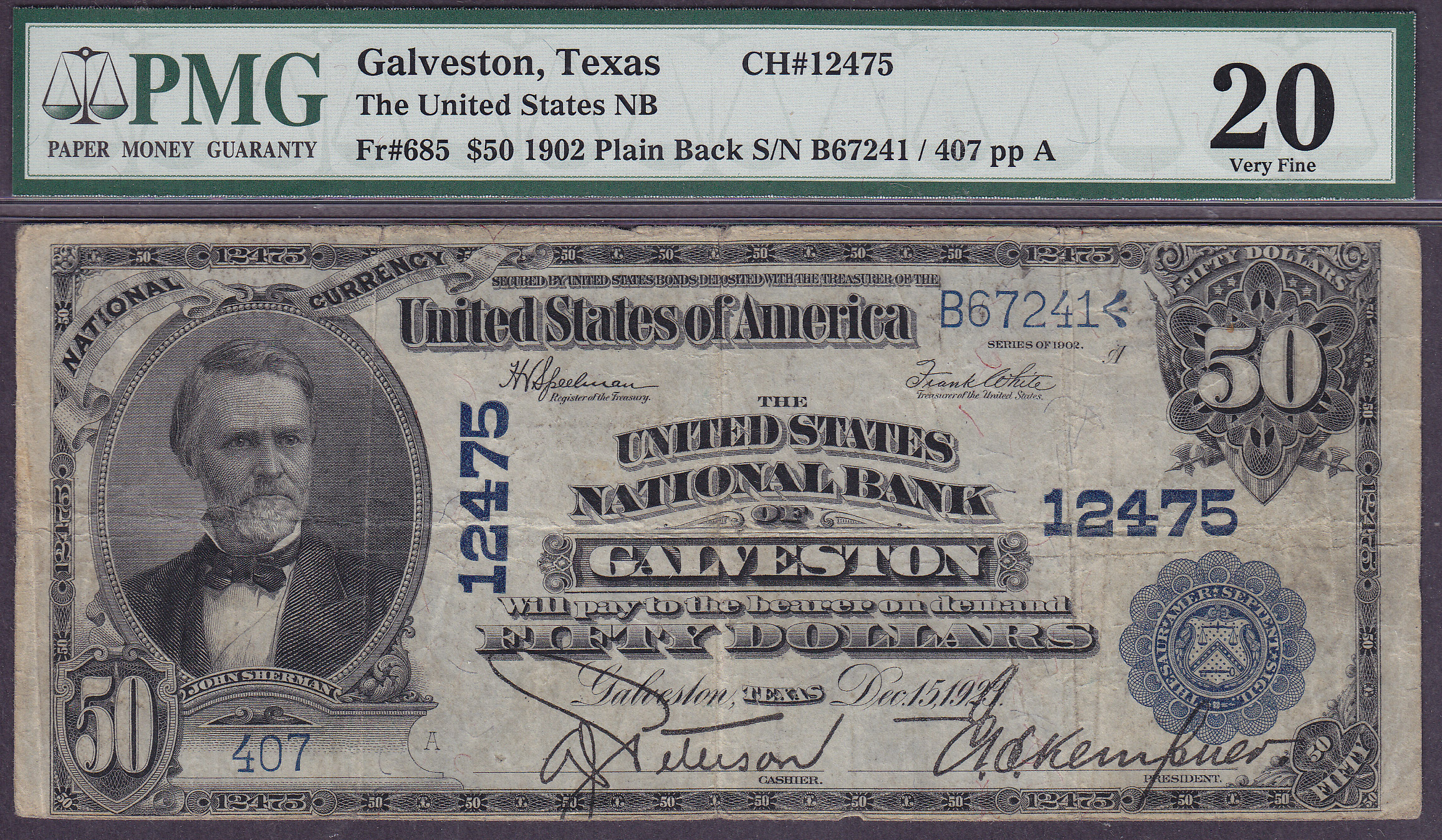 Here is a real nice example of a 1902 $50 Plain Back from the United States National Bank of Galveston, TX. The bank serial # is 407 and the Charter # is 12475. This is one of the "Forbidden Tttles" that uses the word, United States in its name. Some collectors search for these types of notes only. There are only eight known 1902 $50 Plain Backs known from this bank. Check out the great signatures!
