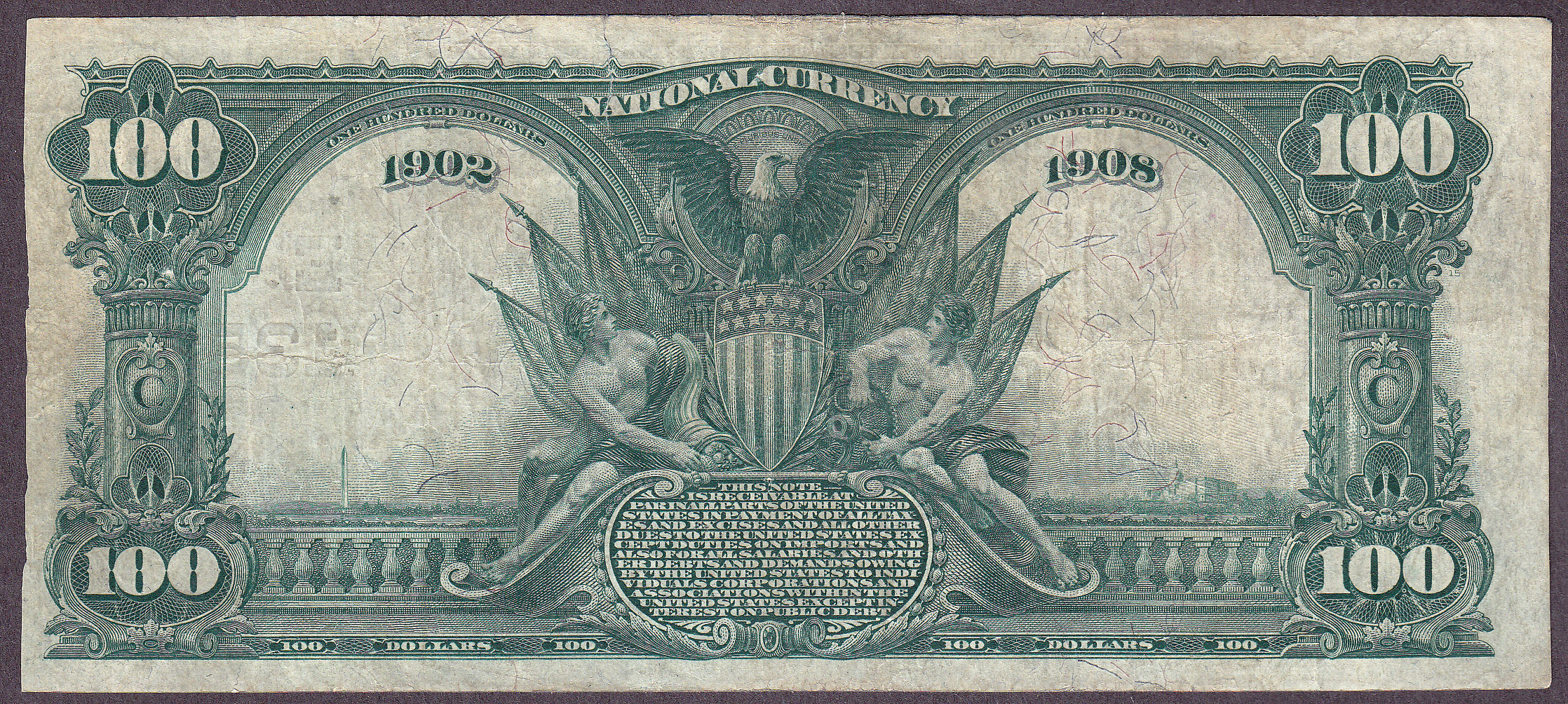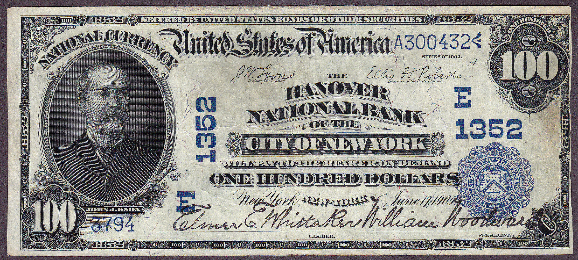 There are only 2 of these $100 1902 Date Backs notes known from this bank. This is a 1902 $100 Date Back from The Hanover National Bank of The City Of New York, New York. The charter number number 1352 and the serial number is 3974. There is a 1/2" tear at the top to the right of mid center below the "ER" of Americia. There is a pinhole between the "N" and "D" of ONE HUNDRED. There are no other distraction that I can see. There is plenty of crispness in the paper. With on 2 known, this note should get a lot of attention. Check the large scans.