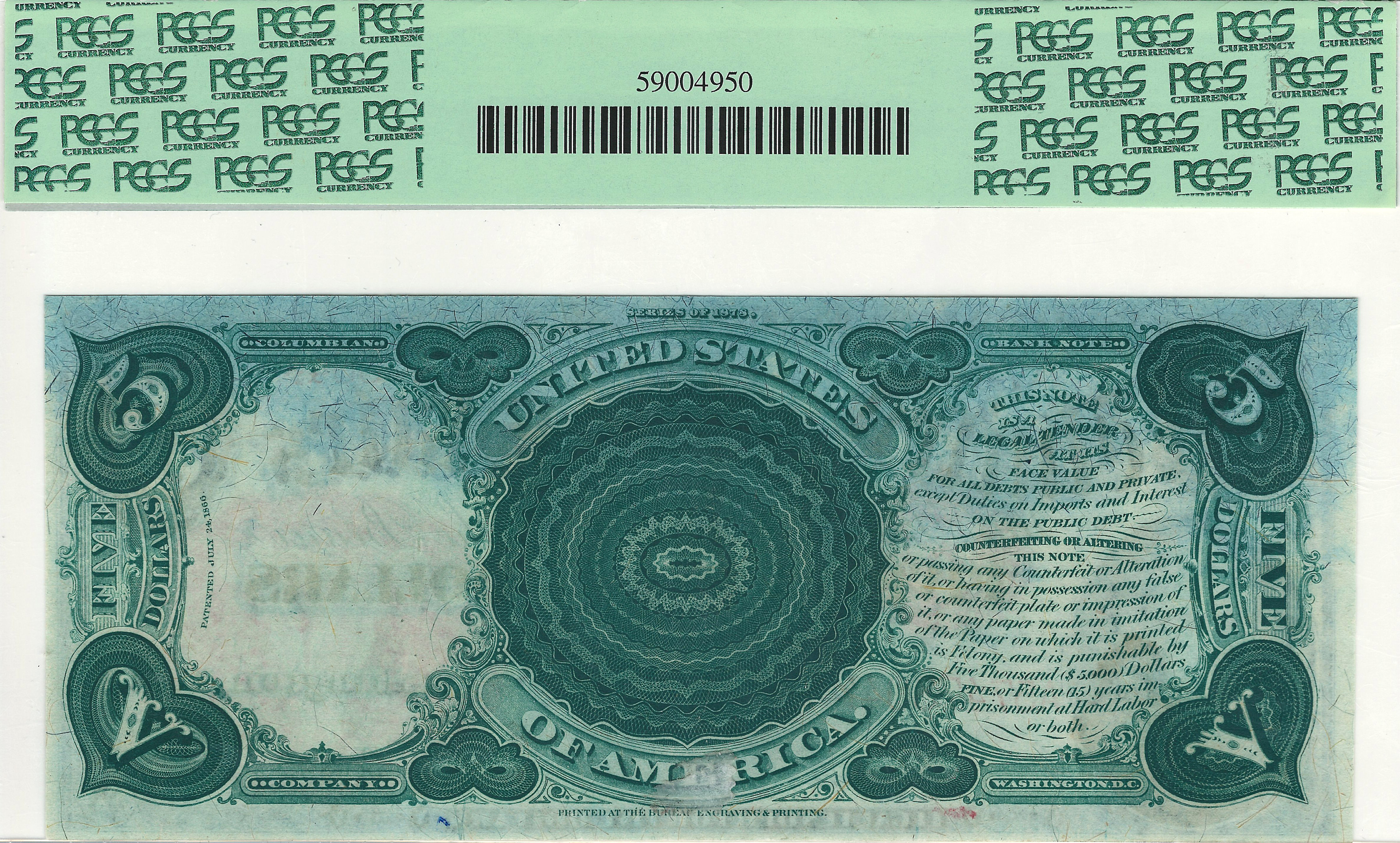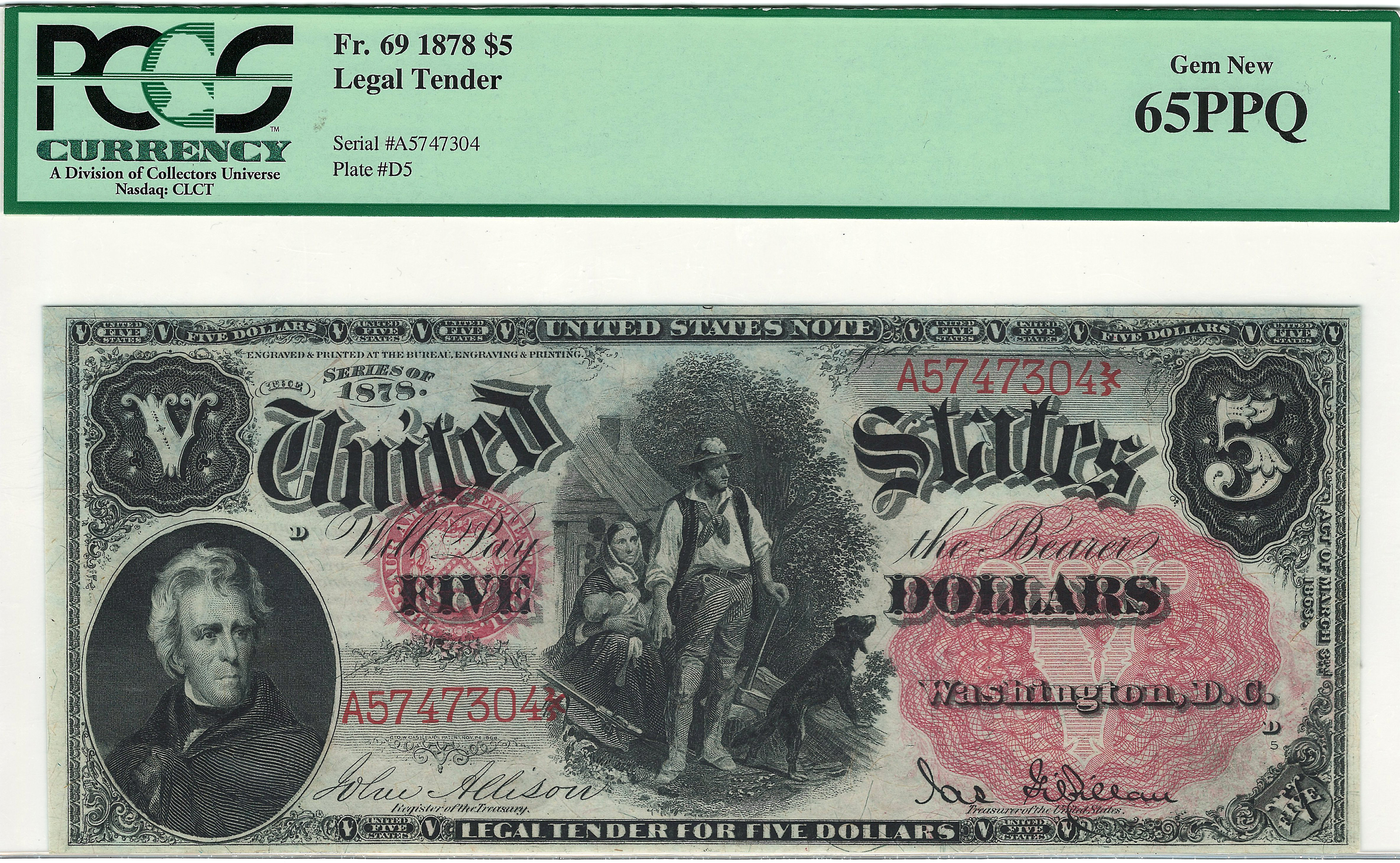 This is an outstanding example of the earlier 1878 $5 Legal Tender or commonly refered to as the Woodchopper or Pioneer note. The serail number is A5747304 and is in a GEM PCGS-65PPQ holder. It also features the small red seal with rays. Andrew Jackson the seventh President is on the left and a painting of the Pioneer family is in the center. There are no rips, tears or pinholes. This a totally GEM example.