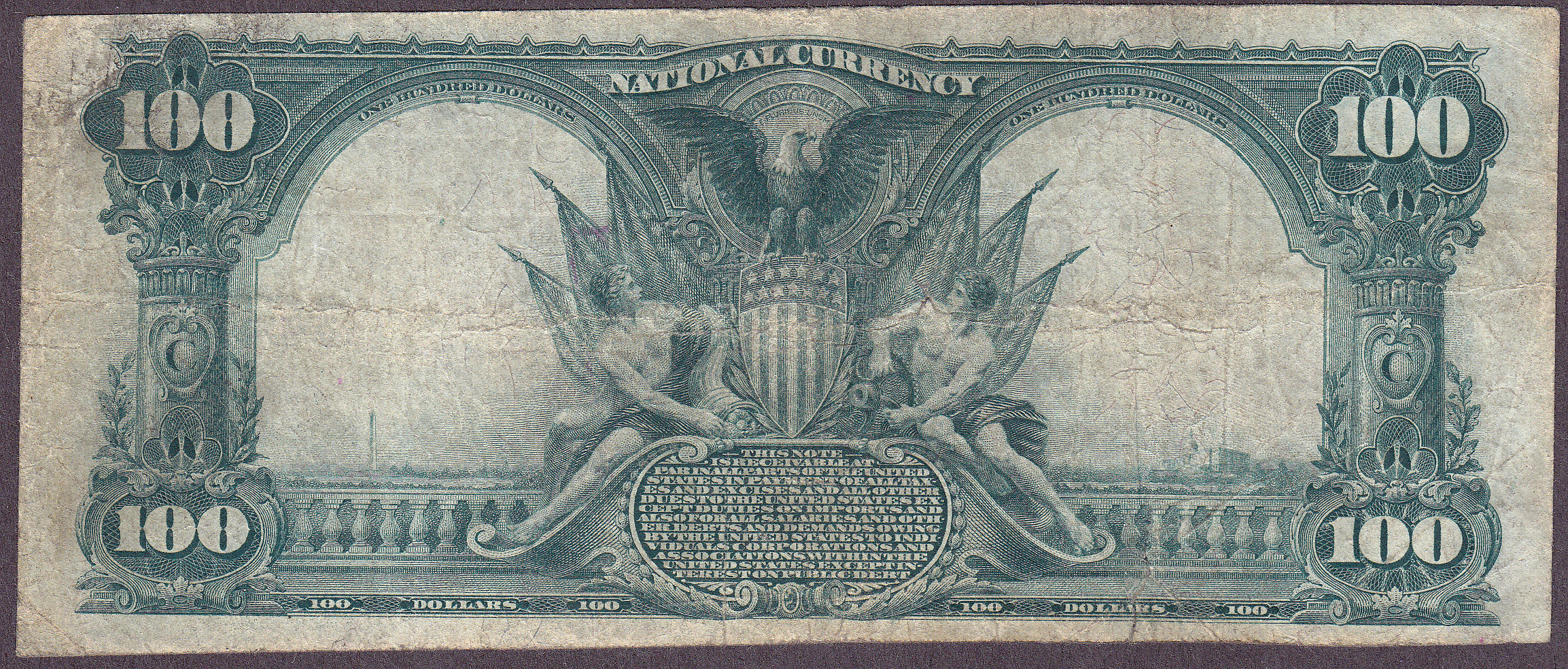 This is a 1902 $100 NBN from the Commercial National Bank of Shreveport, Luisana. The Charter number is 36oo and the serial number is 6919. I found two pinholes, one by the "N" of national Bank and the other in the "O" of National Bank. There is plenty of paper crispness left in the paper, not limp like so many others. I would call this a solid VF note. Accordingly there are 6 of these known on the bank. Check the large scans for more details.