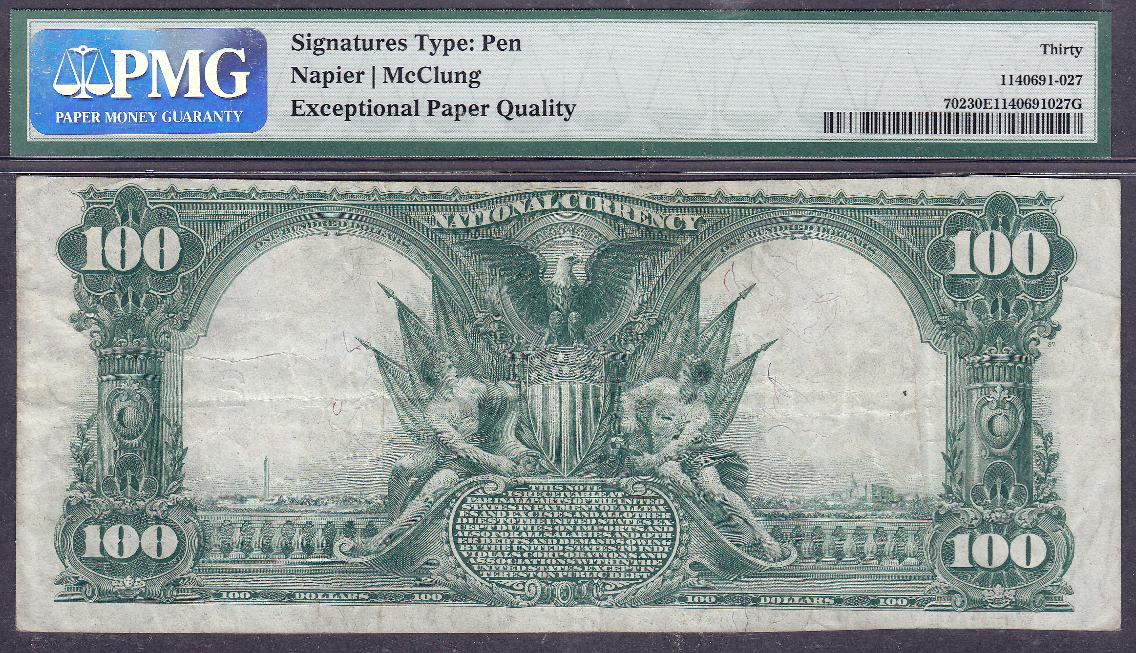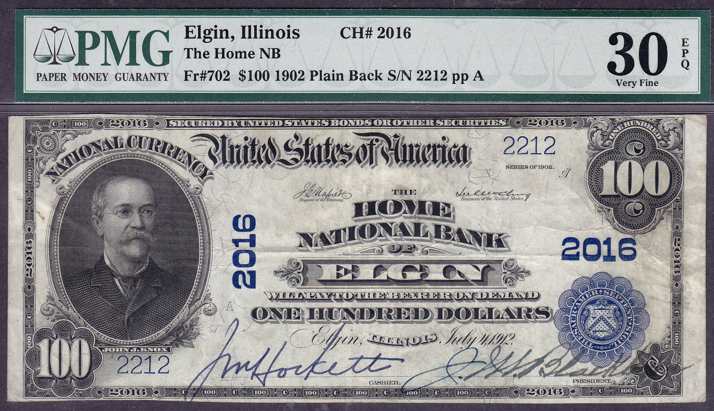 This 1902 $100 Plain Back from The Home National Bank of Elgin, IL is graded a PMG VF-30EPQ. The note has decent centering. The signatures are strong and legible. There are no rips, pinholes or tears. Totally original! The serial number is 2212 and the charter # is 2016.