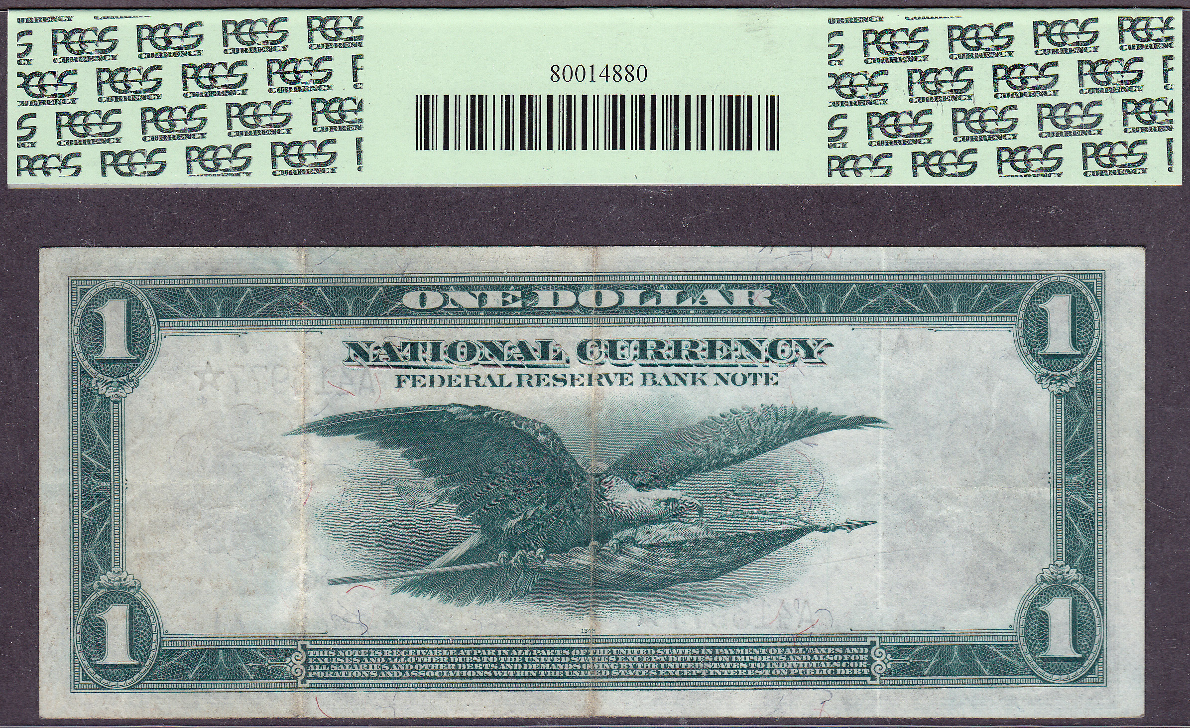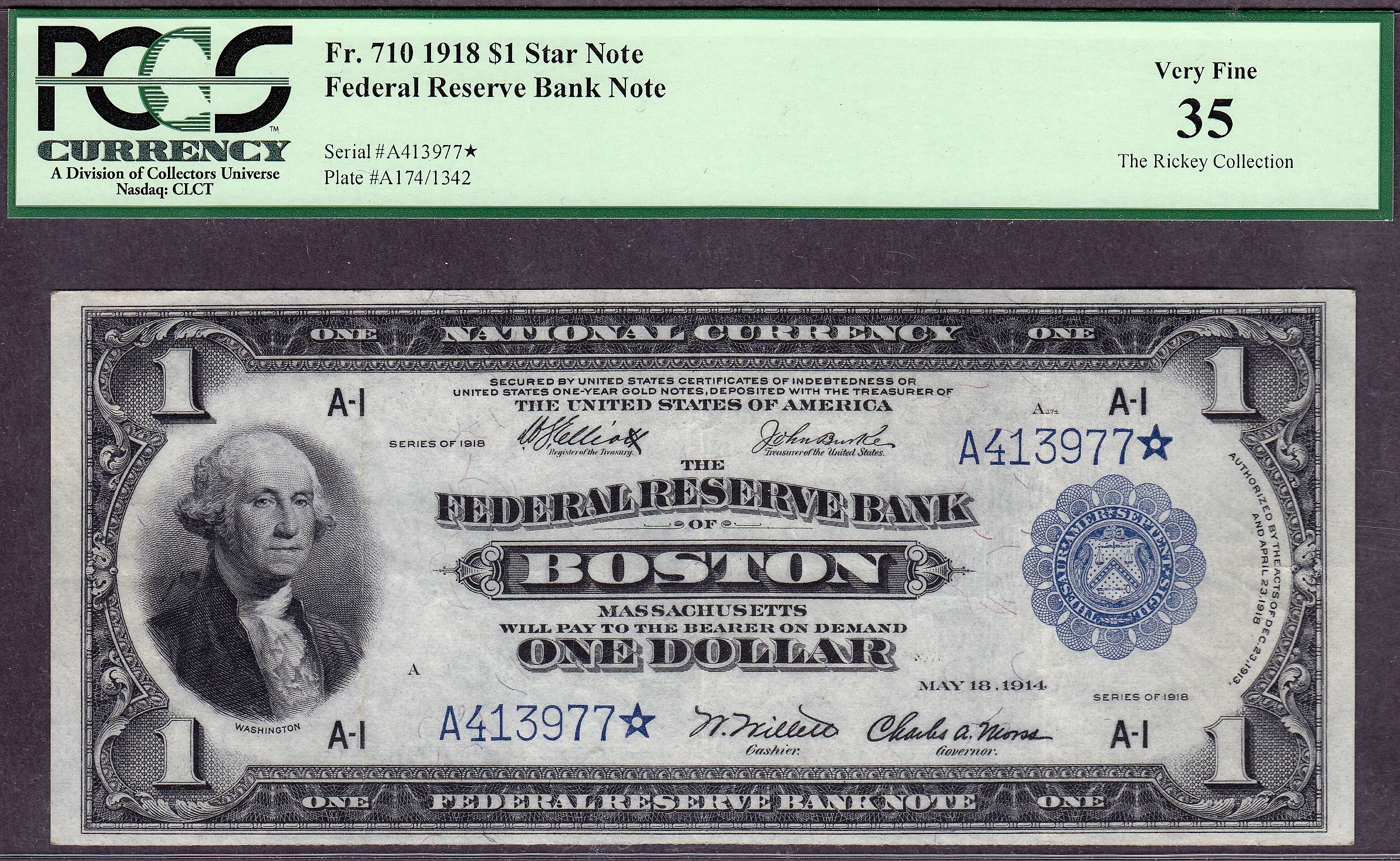 This is a very desirable 1918 $1 FRBn Star from the tough Boston district. According to Doug Murrys Large size book there are only 18 known. This is by far one of the finest known. This note is from the famous "Rickey Collection".