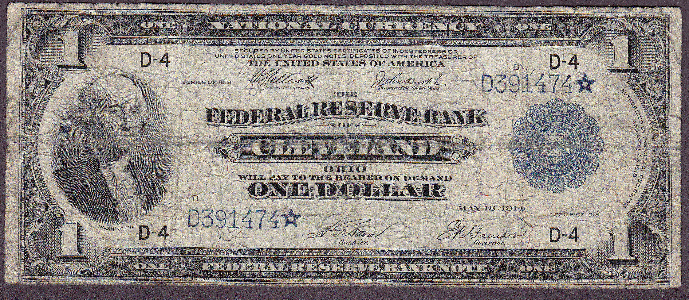 This is a low grade but rare Fr.-720* or a 1918 $1 FRN star note from the Cleveland district. There are only 14 known in all grades and this one, believe it or not is in the middle of the pack. The serial number is D391474*. Its definitely priced for a quick sale. Check the scans for the condition. i would call it a VG/Fine.