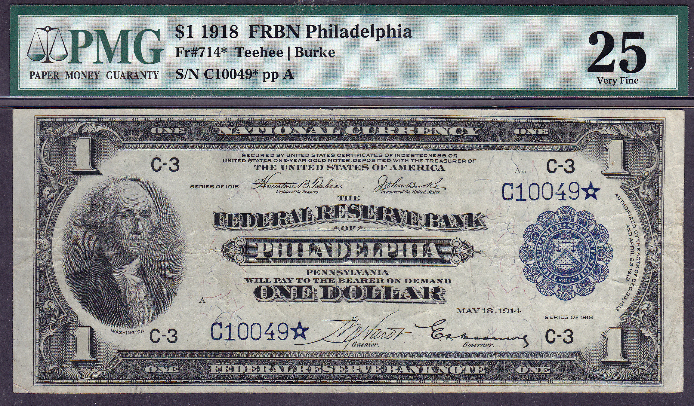 Fr.-714C* 1918 $1 Philadelphia, PA FRBN Star Ser. # C10049* PMG VF-25