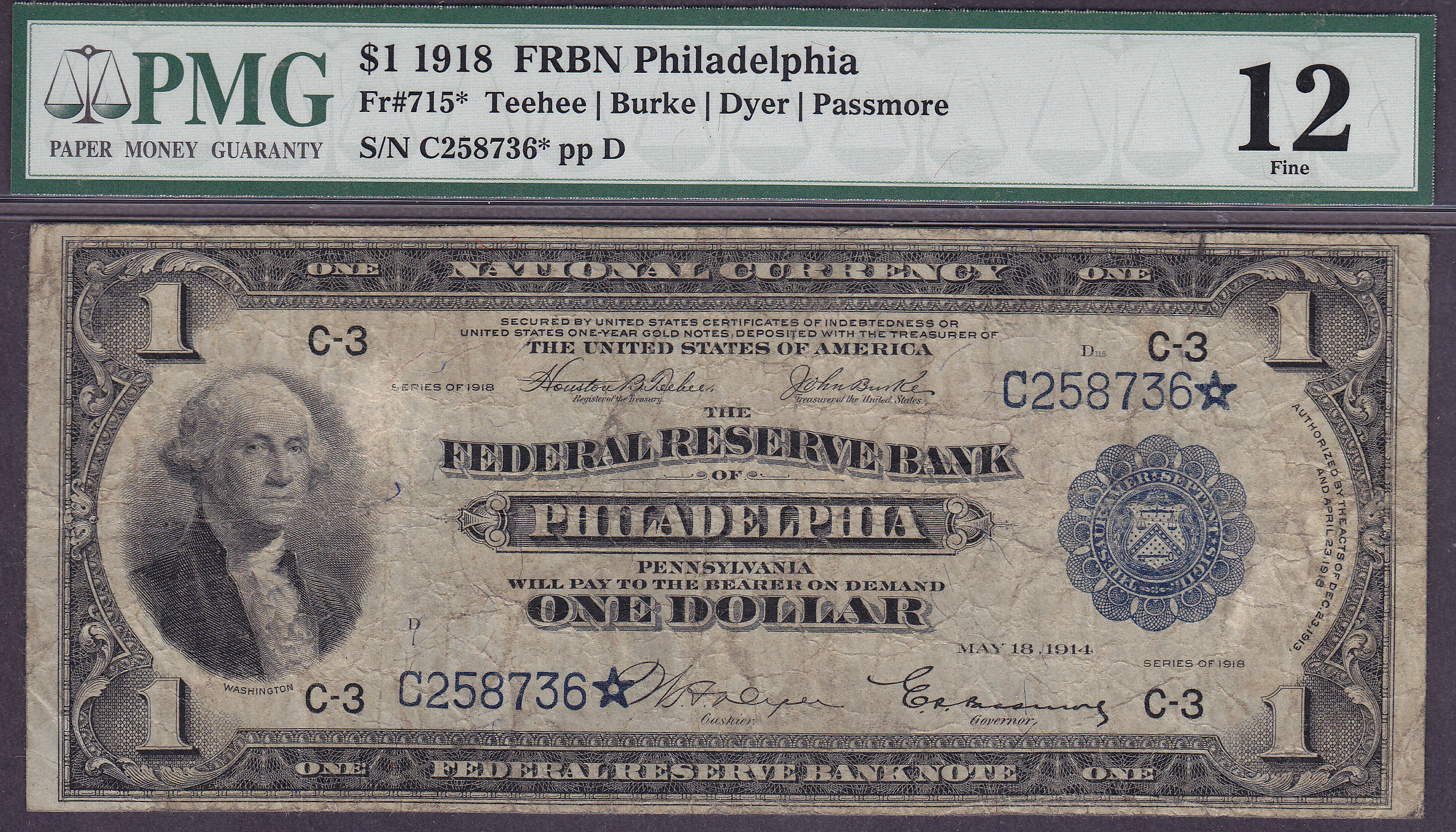 Fr.-715C* 1918 $1 Philadelphia, PA FRBN Star Ser. # C258736* PMG Fine -12