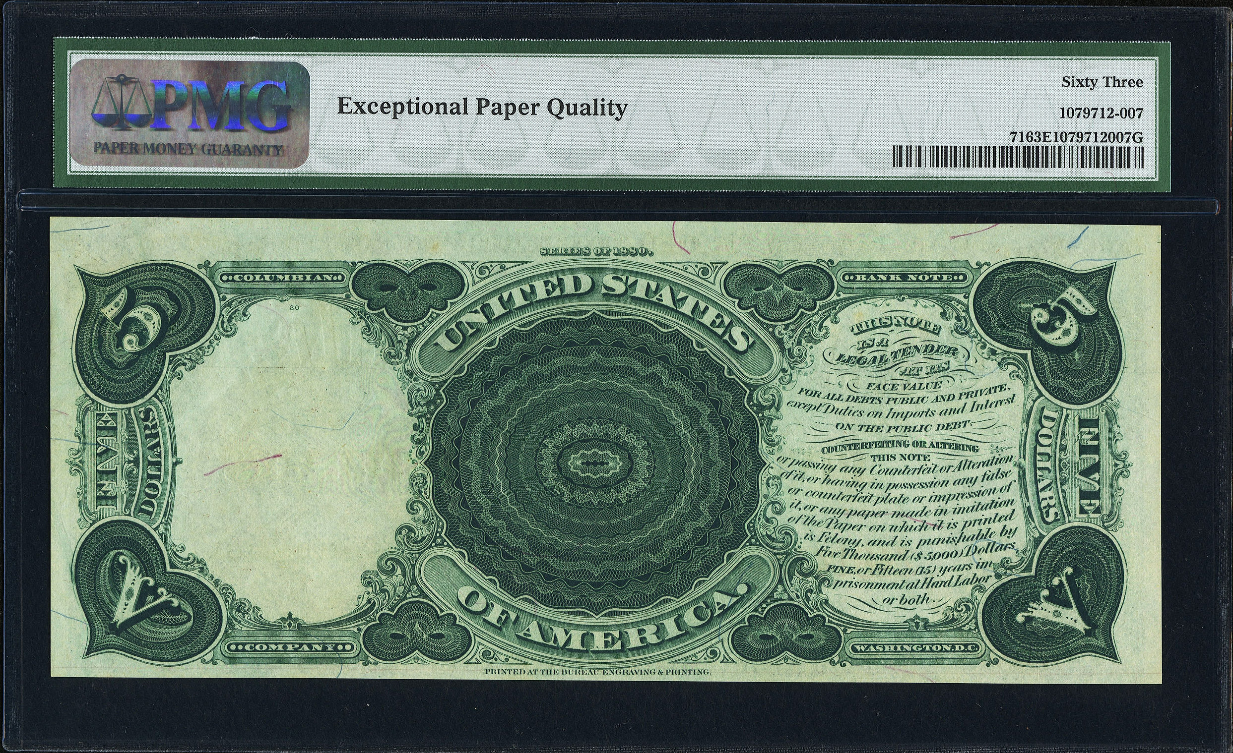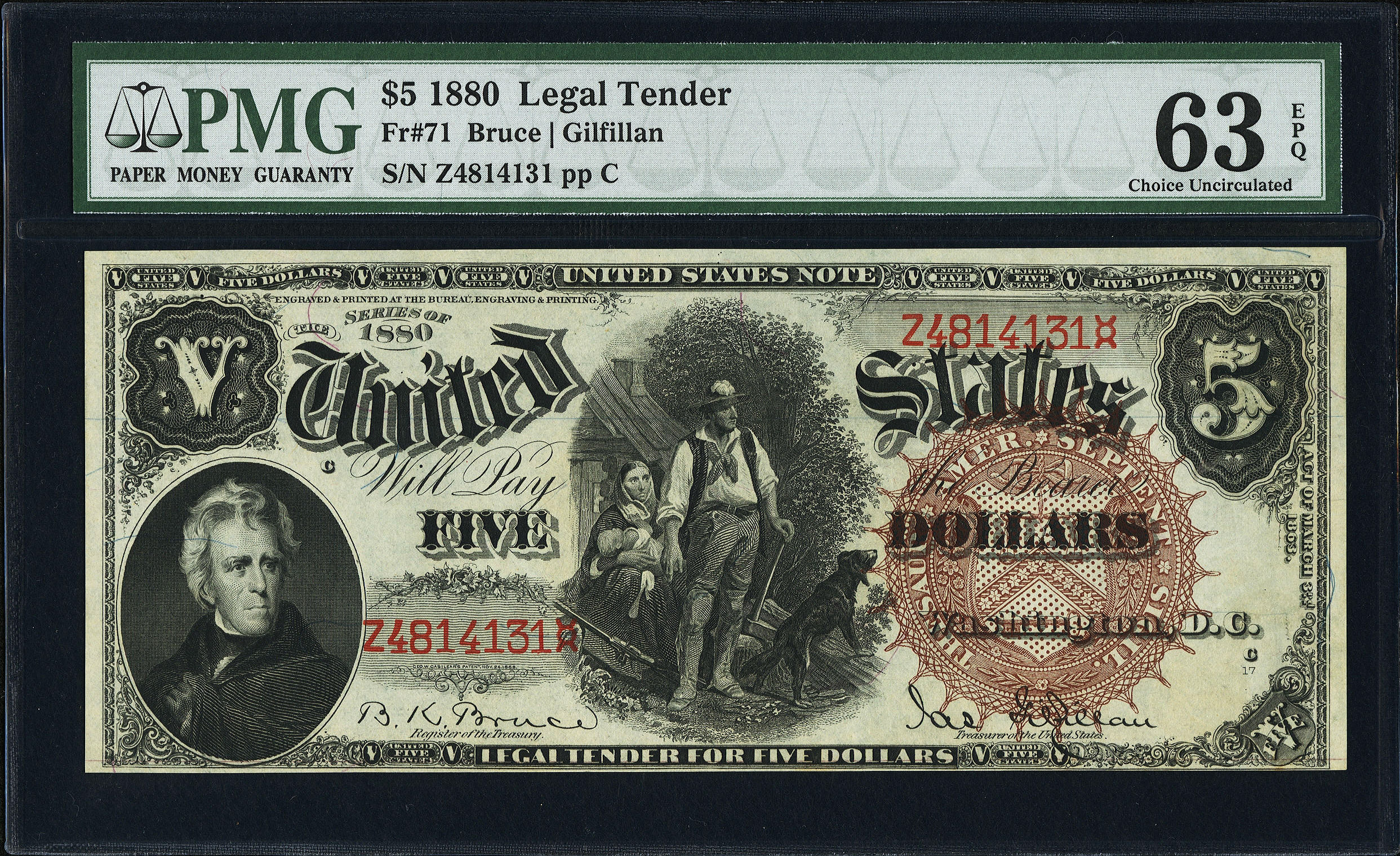 This 1880 $5 Legal Tender with the ever popular Large Brown Spiked Seal features fully origional embossing. Nearly all of the printed details can be easily viewed, even in the third party holder. The colors are strong and with a tad bit more bottom margin this note would have graded a full GEM. It is in a PMG-63EPQ holder. No rips, tears or pinhoiles.