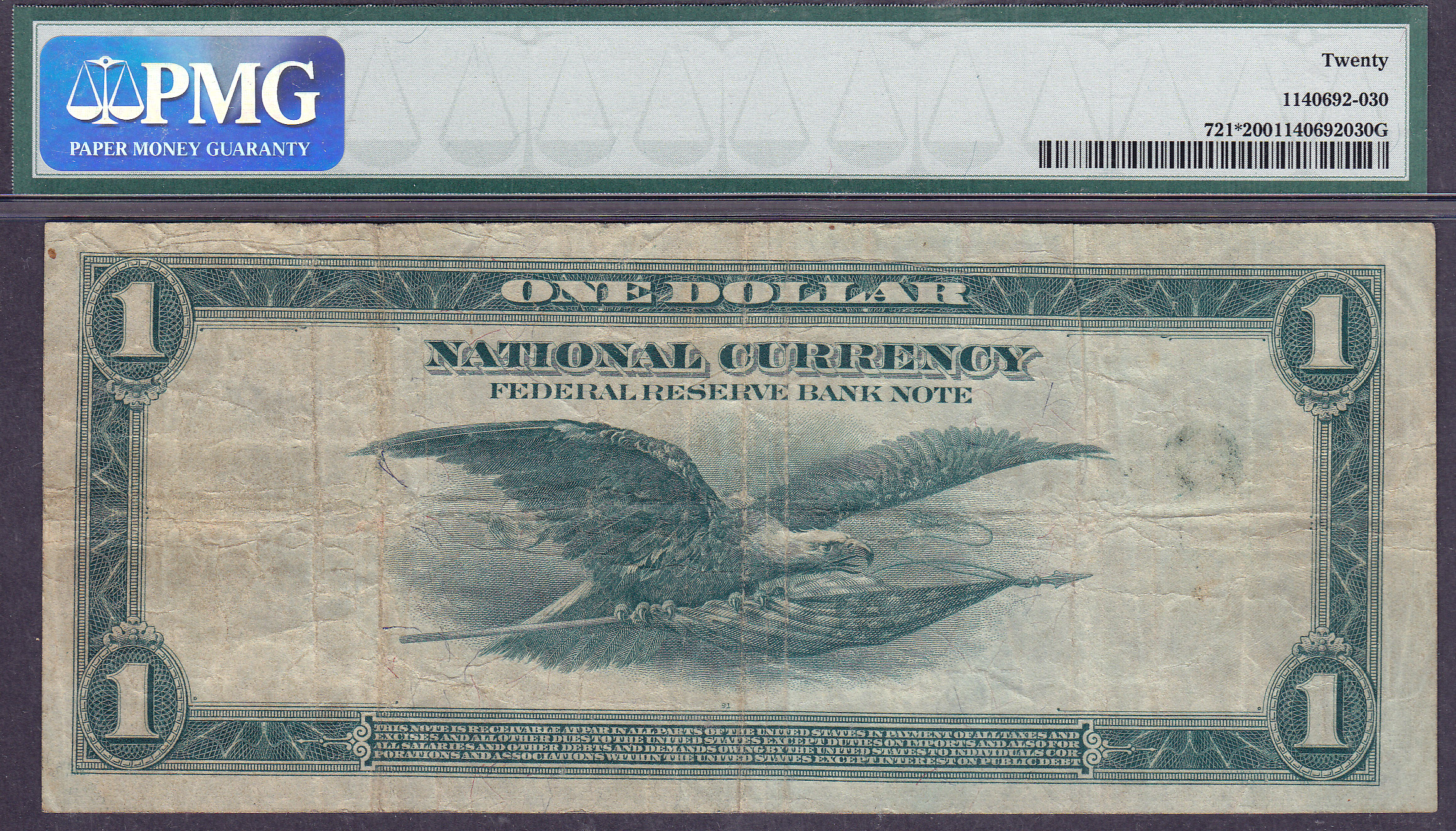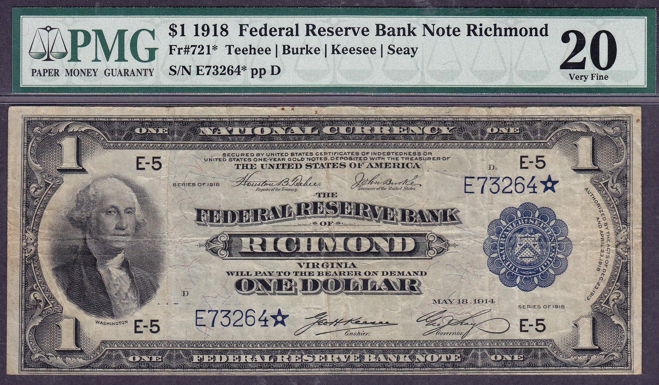 This is a very rare 1918 $1 FRBN Star note from the very tough Richmond District. You probaly have not seen any of these star notes before on ebay as there are only nine (9) known to exist. Most of them are in long term star collections. This note was discovered in June of 1999. This is the third finest of the nine known In Doug Murrays US Large Size Star Note book. There are only two higher graded Extra Fines notes known to exist. Richmond has always been one of the toughest districts on any large size note, especially star notes. The serial number is E73264*. It is in a PMG VF-20 holder. There are no rips, tears, pinholes or missing pieces.