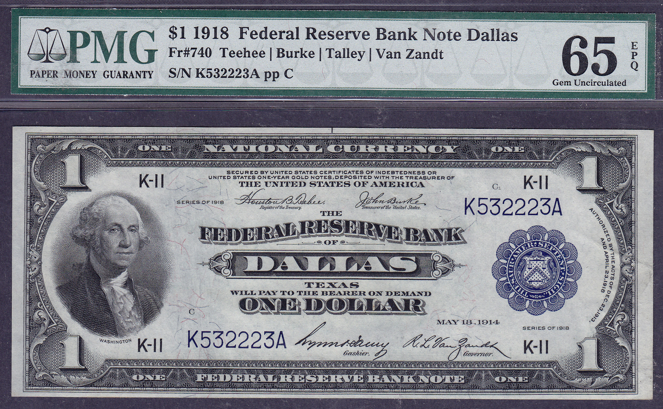 Here is one hell of a nice Dallas 1918 $1 FRBN in pristine condition. Try finding a Dallas FRBN in GEM condition. it took me many years to find one. The serial number is K532223A and it has been graded as a PMG-65EPQ.