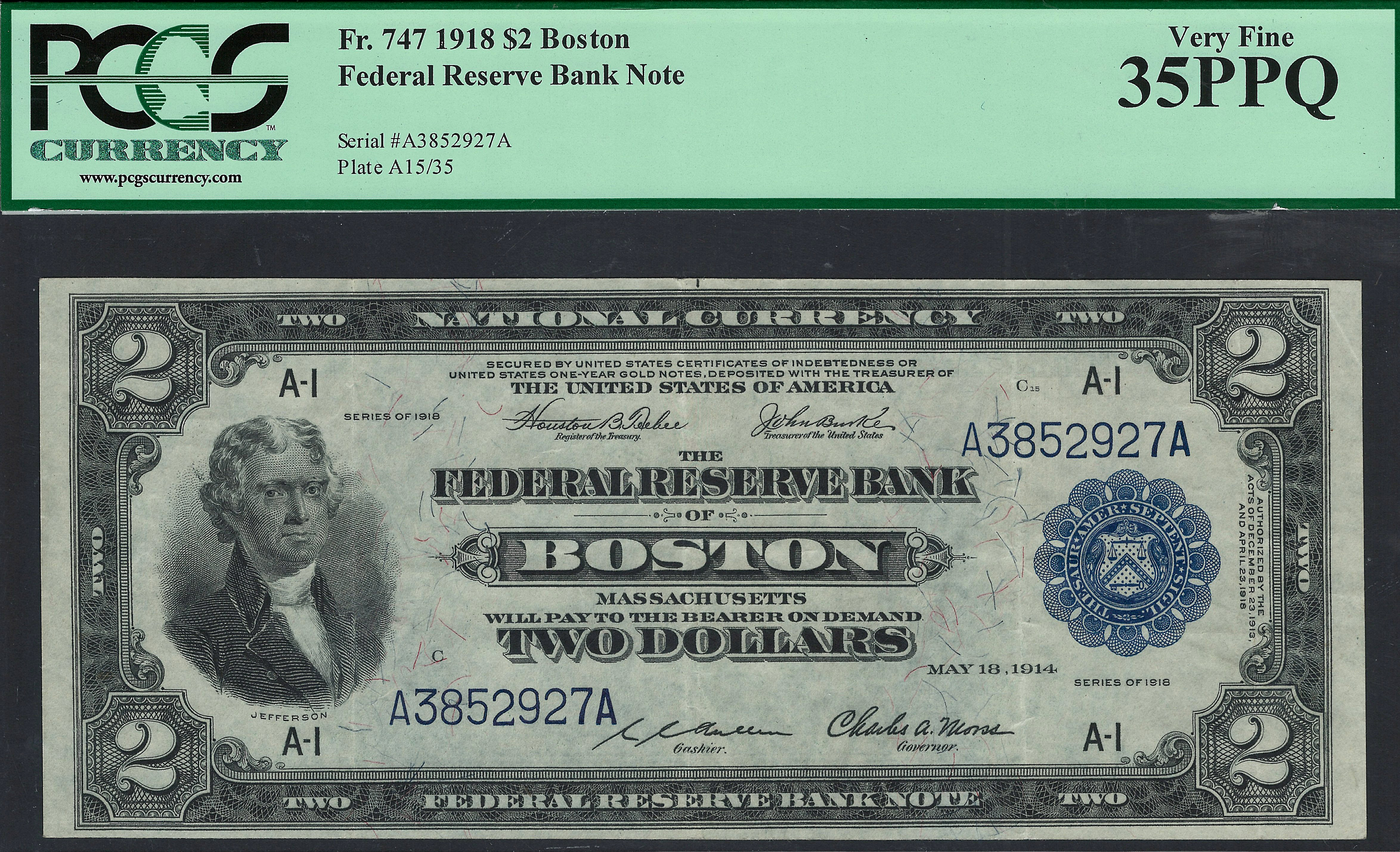 This is a very nice 1918 $2 Boston Battleship in a PCGS-35EPQ holder. the reason I purchase this not is because it is difficult to find a nice clean midgrade Battleship that has never been doctored or cleaned and pressed. The serial number is A3852927 and it resides in a PCGS VF-35 PPQ holder. Most of these notes come in GEM condition and sell for $3800 to $5400 depending on the district. This 1918 $2 battleship would make a very nice note for the type collector who does not want to spend a ton of cash to acquire a nice EPQ/PPQ example. I try to buy only EPQ and PPQ notes.The front shows the head of Thomas Jefferson the President of the United States from 1801 to 1805 and the back displays a 1914 era US Battleship.