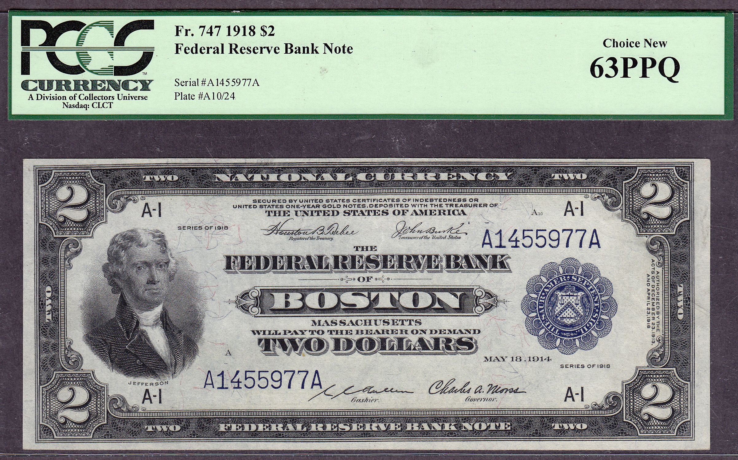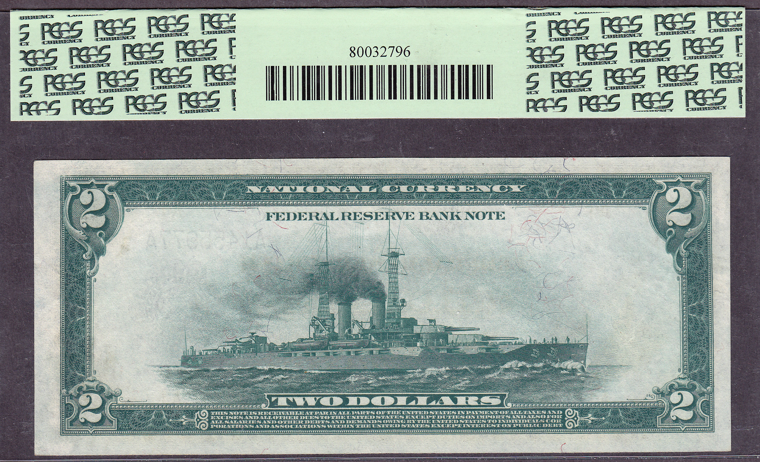 This is the famous 1918 $2 "Battleship" from the tough Boston District. These notes are one of the most collected by all collectors. Boston is also the first district. This note would garner a total GEM is the top margin was a bit broader. There are no rips, tears, folds, pinholes or marks. Its totally original as the "PPQ" by PCGS designates. The serial # is A1455977A. Check the broad margins on the back. You can also see the embossing through the holder. It has been graded as a PCGS-63PPQ.