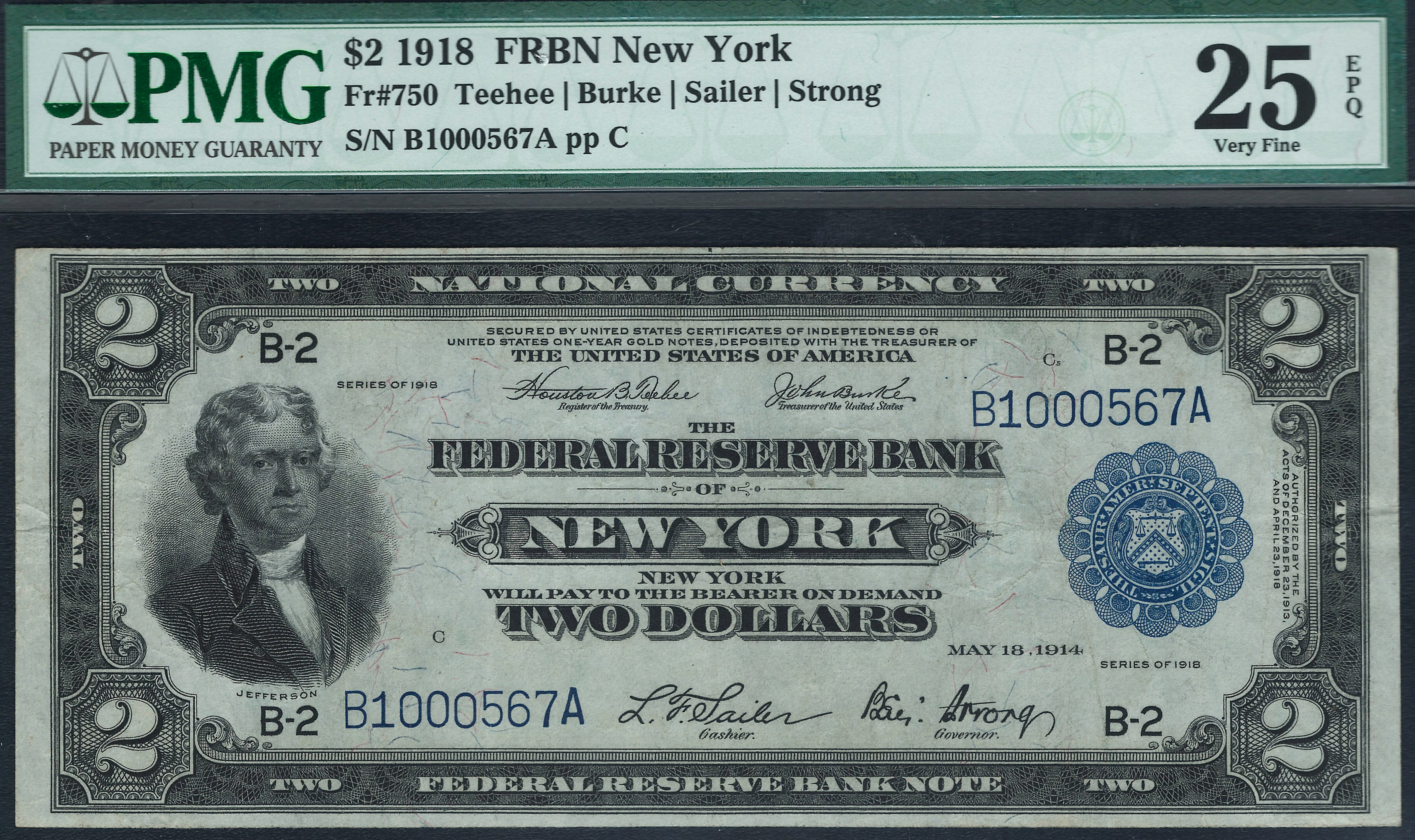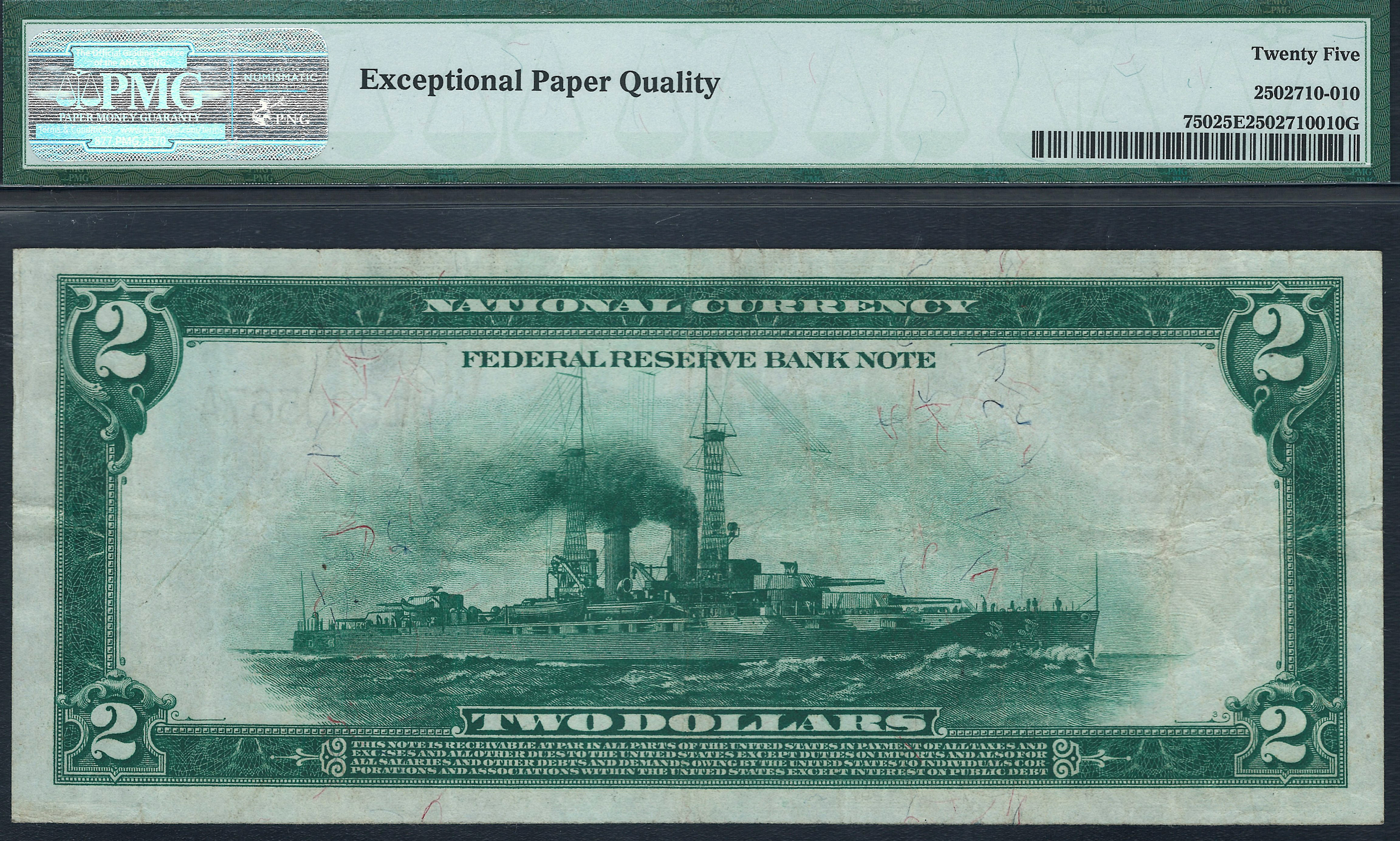This is a very fine example of the famous 1918 $2 Federal Reserve Bank Note commonly referred to as the Battleship because of its back design. This EPQ example hails from the popular New York District. Only on exceptional notes will PMG will notate EPQ on a PMG-VF-25 note. Because of the obvious originality they have done so on the example. The main reason I purchased this $2 Battleship note was because of the EPQ notation and it is totally free of any issues. It is not often than I can offer a nice mid grade EPQ Battleship to my clients as a low cost type note. I guarantee at this price, IT WILL NOT LAST LONG! The serial number is B1000567A and it is in a PMG-25EPQ holder. Did you notice the last 3 digit serial numbers, 567A. Nice small ladder.