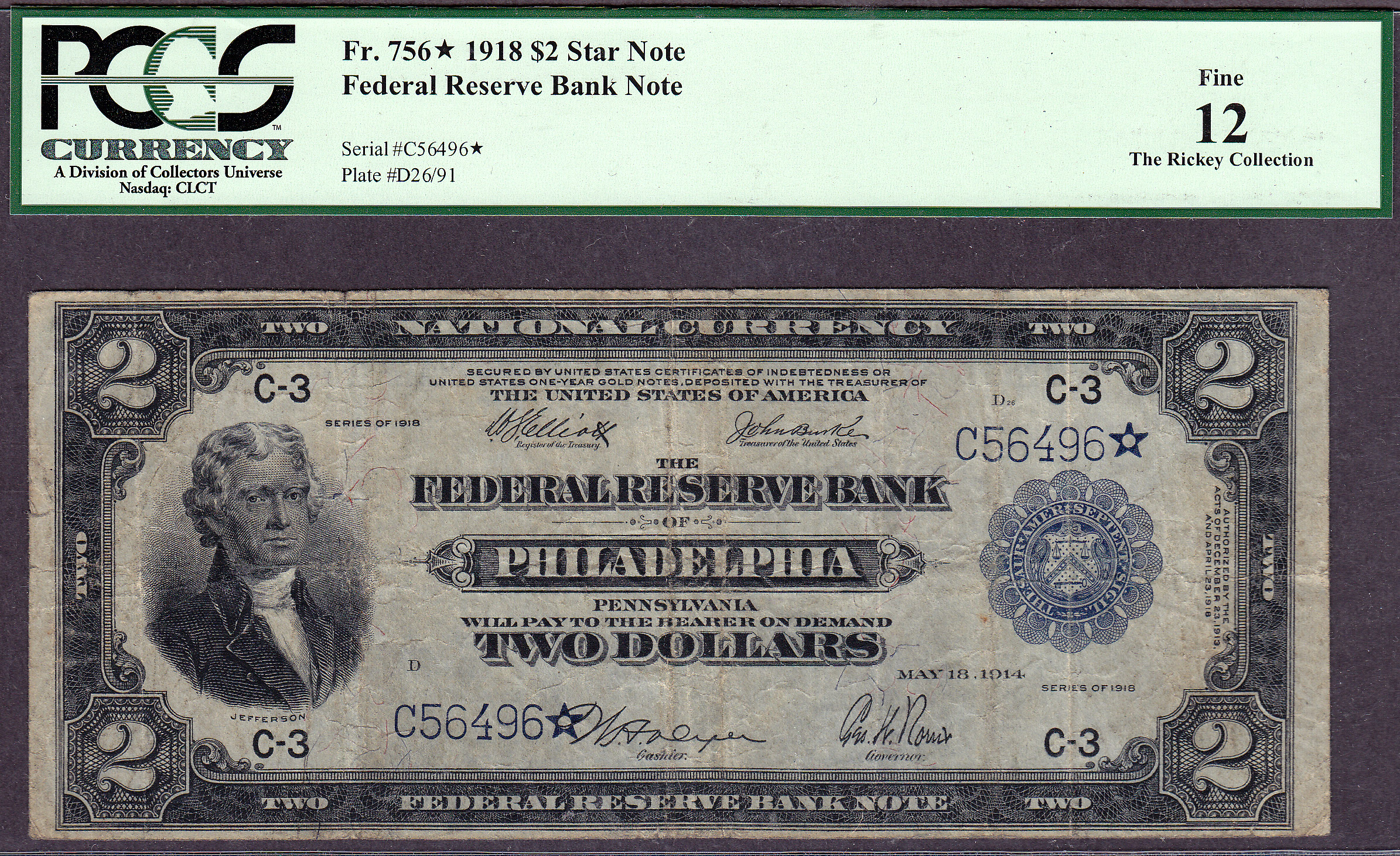 Fr.-756* 1918 $2 Philly (missing) FRBN Star Ser. # C56496* PCGS F-12