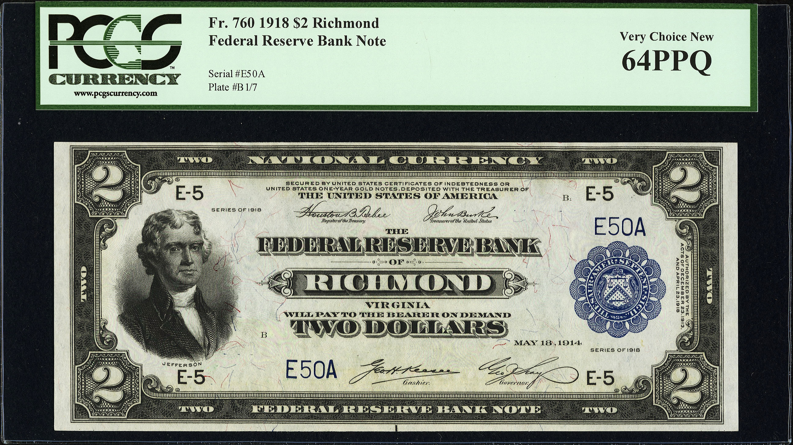 Fr.-760 1918 $2 Richmond, VA FRBN Ser. E50A PCGS 64PPQ