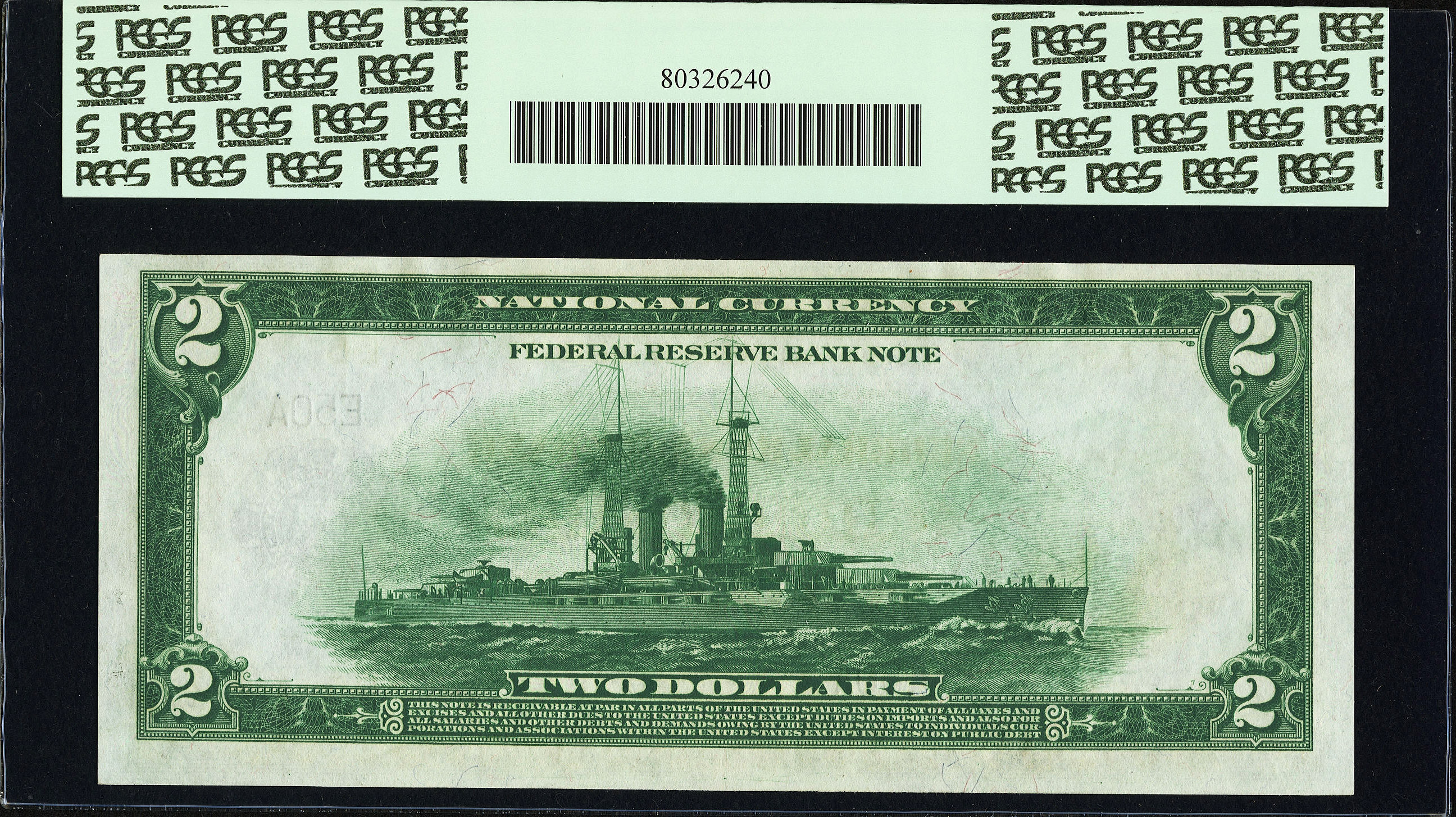 Richmond is one of the 3 key districts notes of the 1918 $2 Battleship series. This Richmond Battleship Duece is replete with bold original embossing and a dark blue seal. Additionally is features a low two-digit serial number E50A. It is from the pedigreed Menlo Park Collection. It is housed in a PCGS-64PPQ holder.