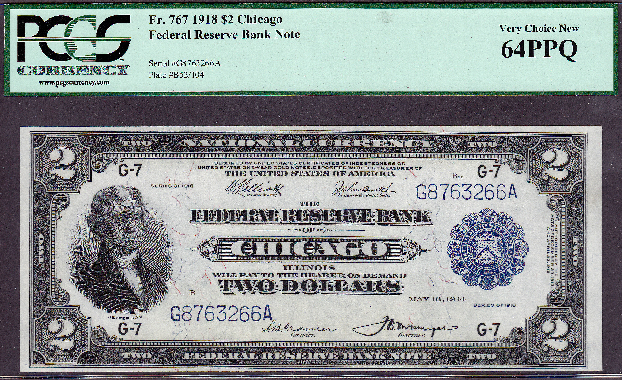 Fr.-767 1918 $2 Chicago FRBN Ser. # G8763266A PCGS-64PPQ