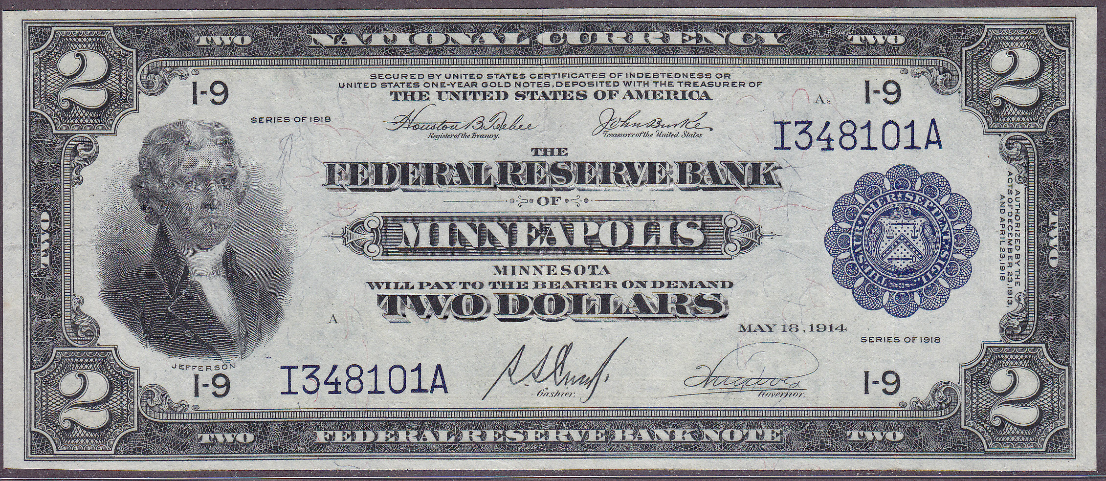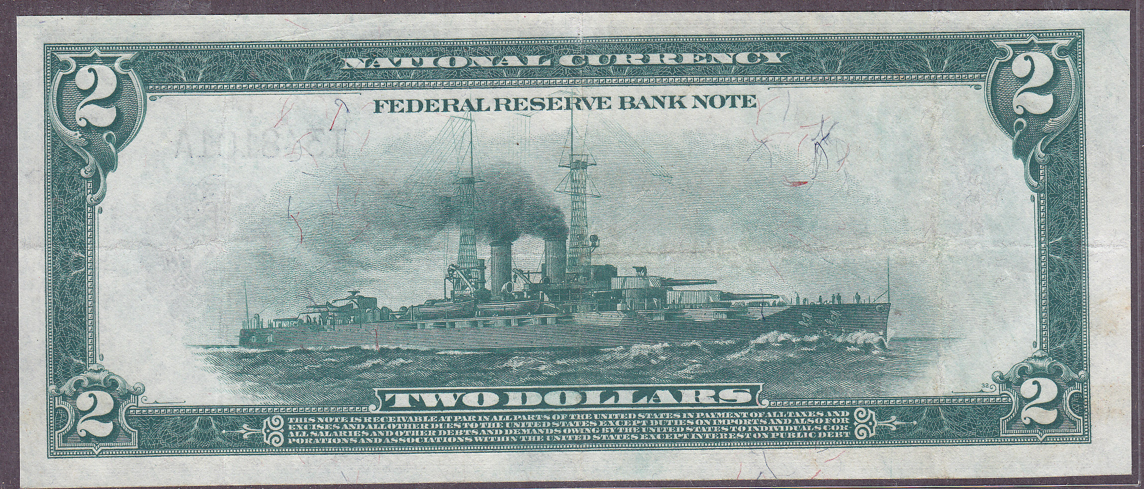 This is a very nice inexpensive and collectible 1918 $2 Battleship FRBN from the tough Minneapolis district. I would normally would sell this ungraded bill at my trade shows because it is not graded and NOT put it on my website. But a lot of my clients want to buy these type of notes because they are very nice and inexpensive. The 1918 $2 Battleships are one of the most collected of all FRBN notes. Minneapolis, Dallas and Richmond are the key districts of the series. This is a very nice and collectible example with no rips, tears bankmarks or pinholes. Check the scans and you will see the nice broad margins on the back and the colorful anti counterfeiting threads on the reverse. This would make a VERY nice type note for the collector who does not want to spend $2000 for a similar example.
