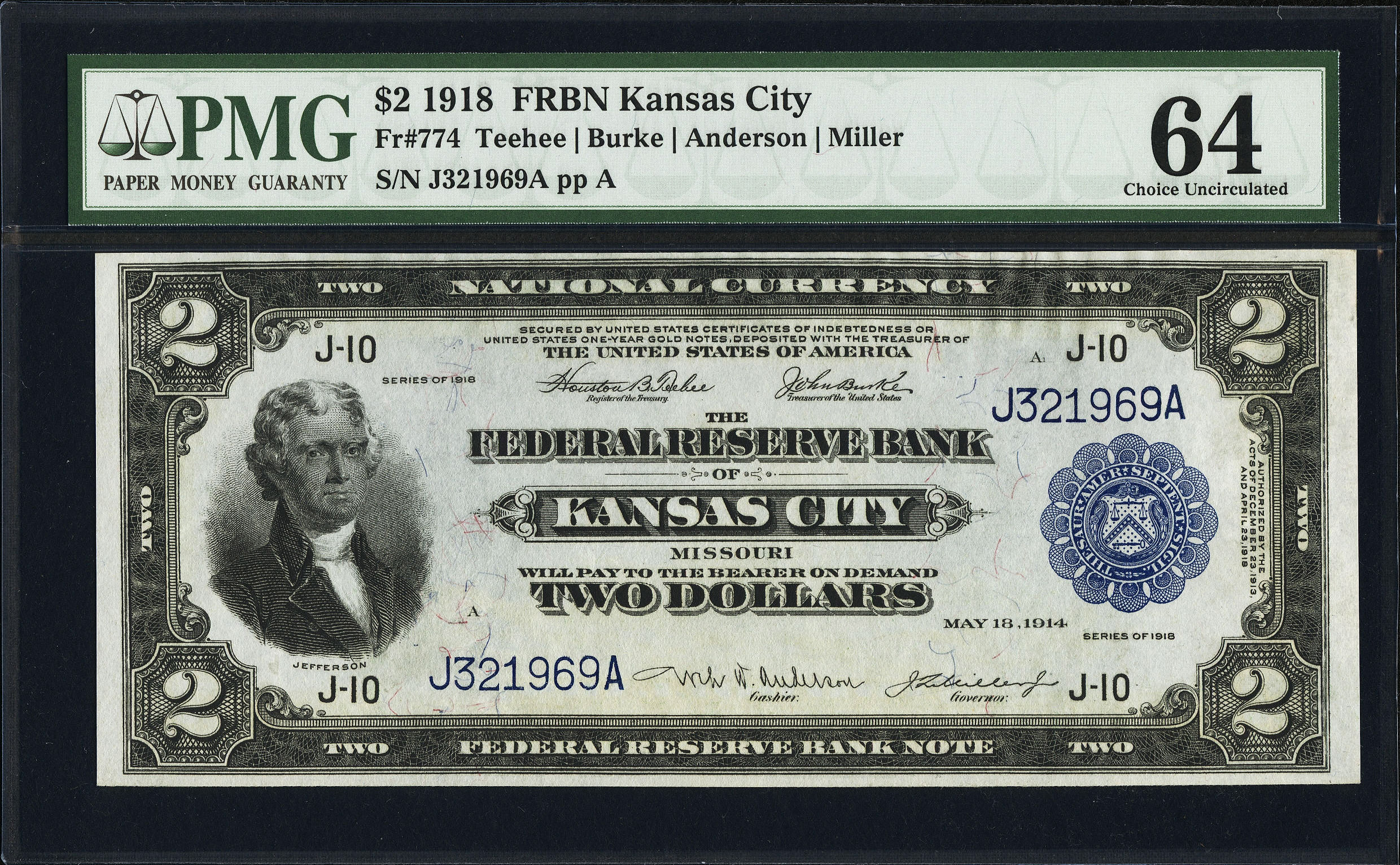 Fr.-774 1918 $2 Kansas City FRBN Ser. J321969A PMG 64