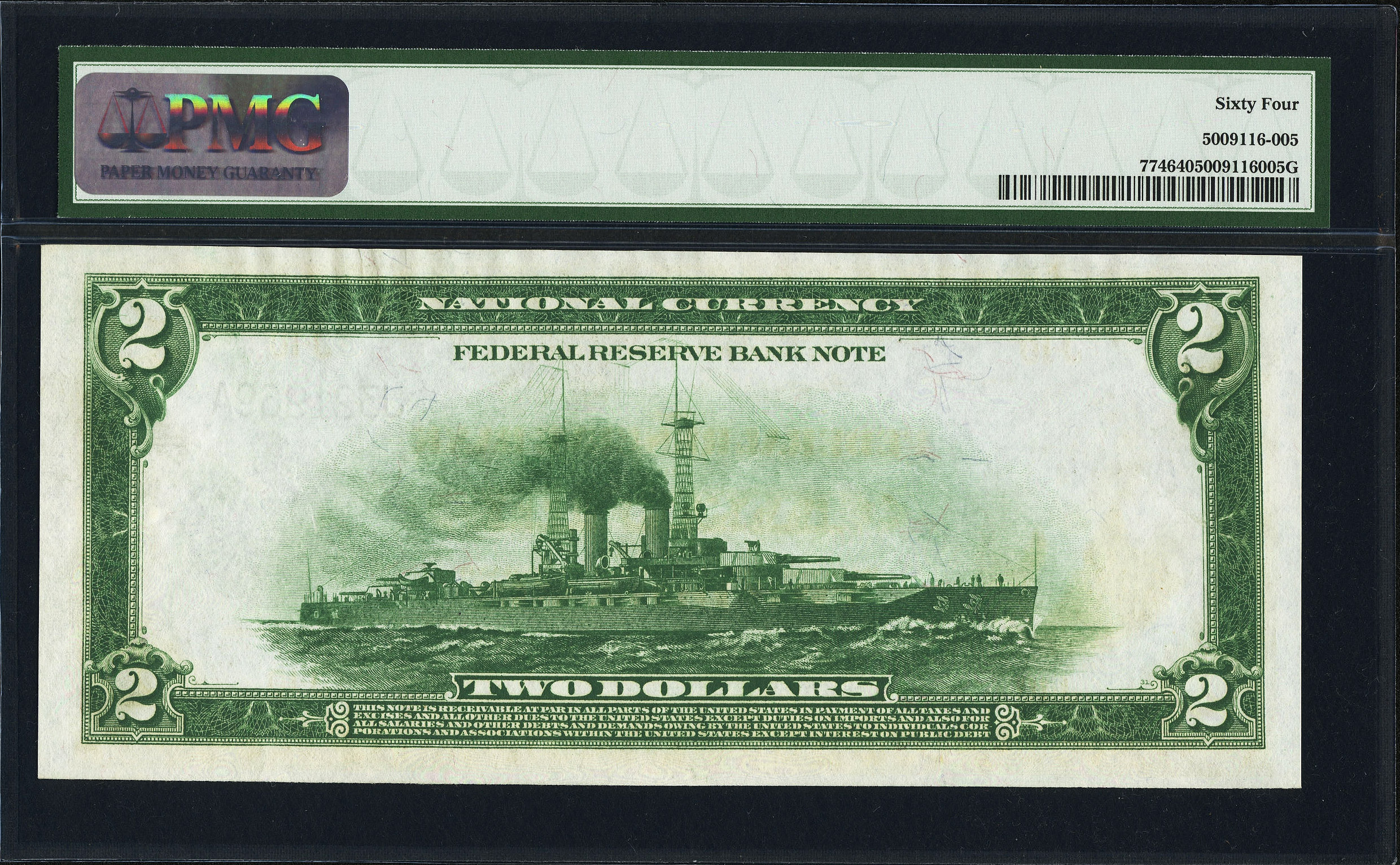 This is a nice 1918 Battleship $2 bill from the popular Kansas City District. IT has ample margins on all four sided both front and back. It actually has GEM margins on the back. The blue scalloped seal is still a vivid deep blue color. Many fibers are still evident on the white crisp paper. It is in a PMG-64 Holder.