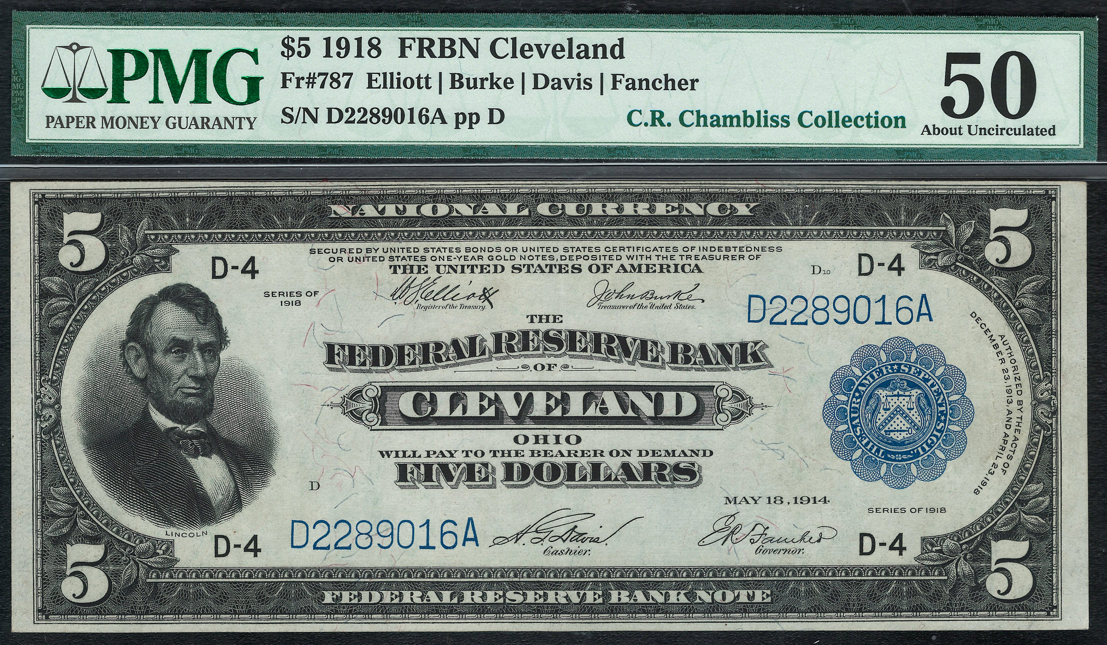 Fr.-787 1918 $5 Cleveland FRBN Ser. D2289016A PMG-50
