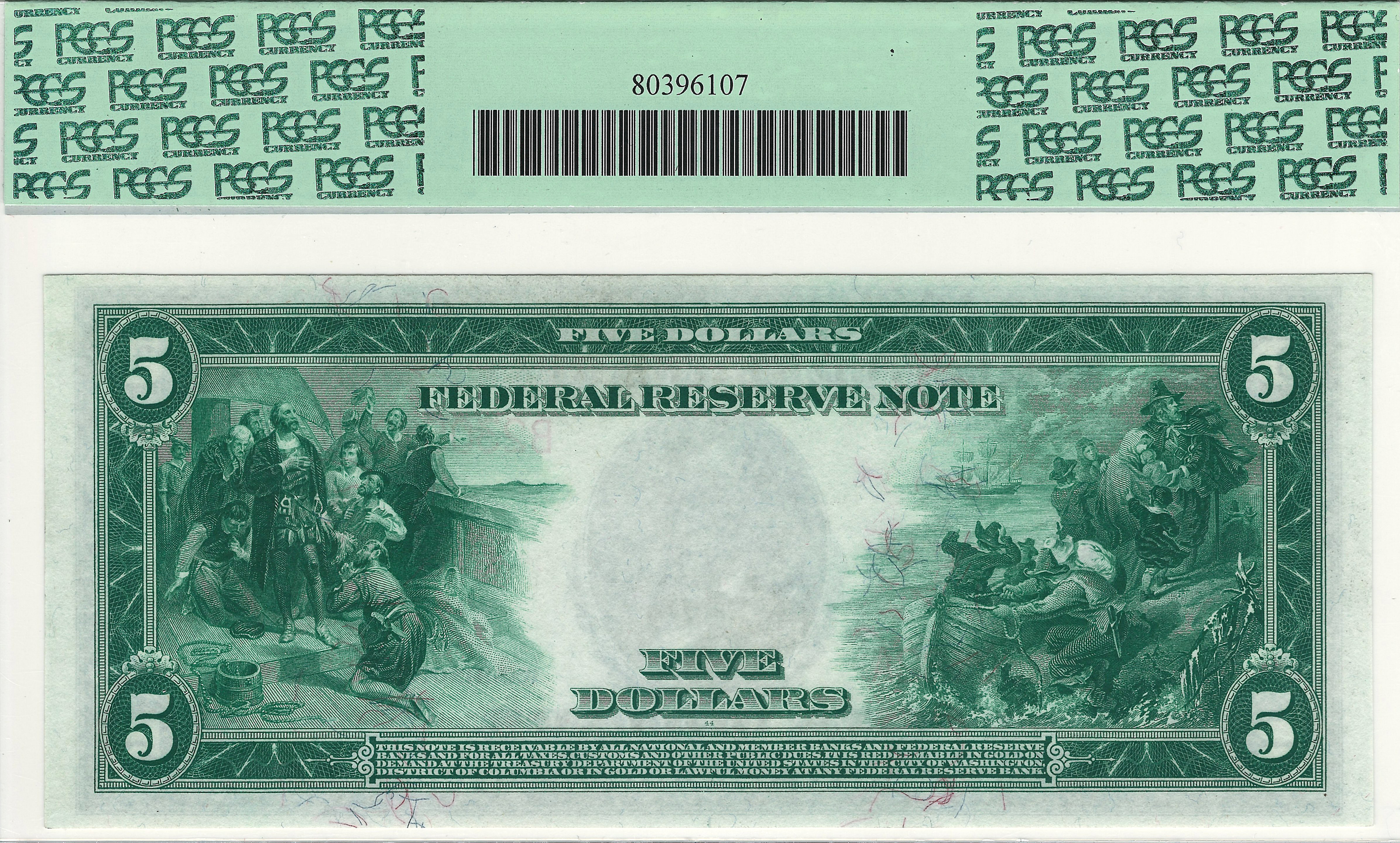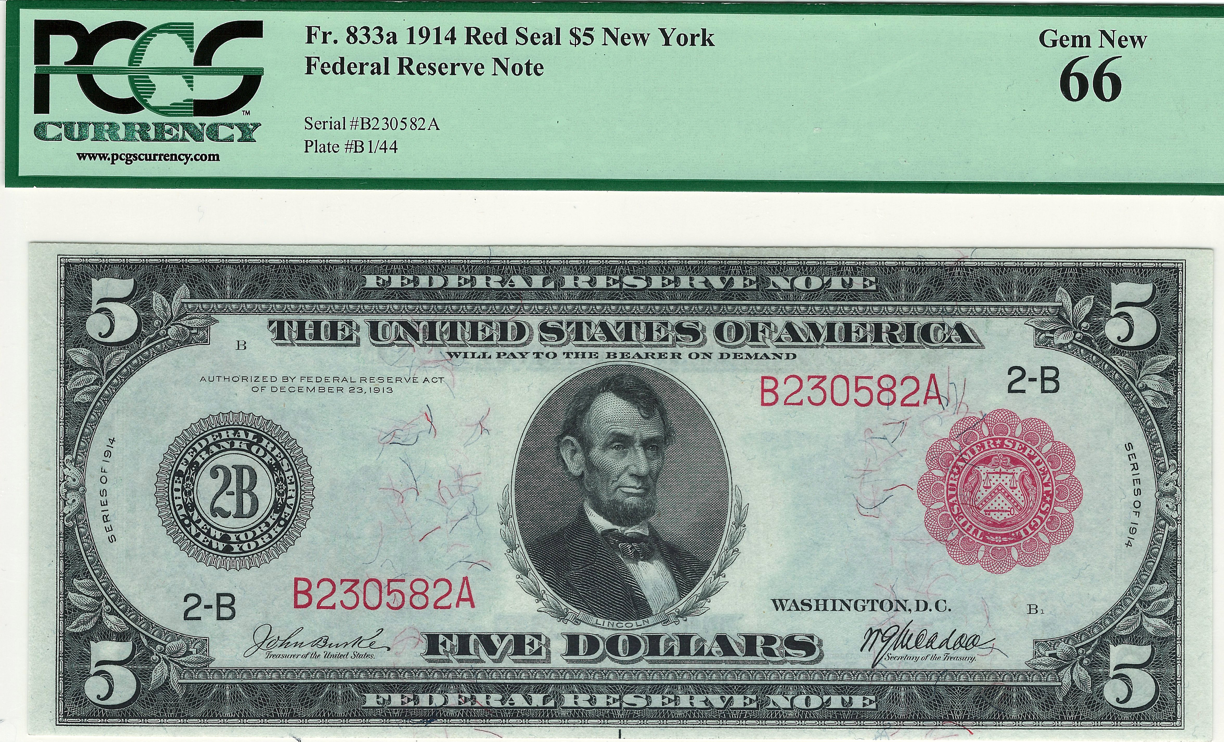 This is the second Finest 1914 $5 New York Red Seal that PCGS has graded. This PCGS-GEM66 note has all the attributes that a collector could want with perfect margins, bright lipstick-red ink colors in the seal and serial numbers and stunning paper quality. Red Seal notes are very difficult to find especially in high gem grade. The anti counterfeiting fibers can be seen clearly on the front. The serial number of this stunning New York Red Seal is B230582A. The mat=rgins are perfect and the corners are squared.For someone who wants one of the finest known red seals thios note is for you.