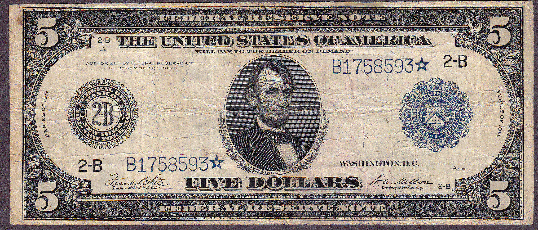 Here is a Fr.-851A 1914 $5 FRN star from new York. the serial number is B1758593*.