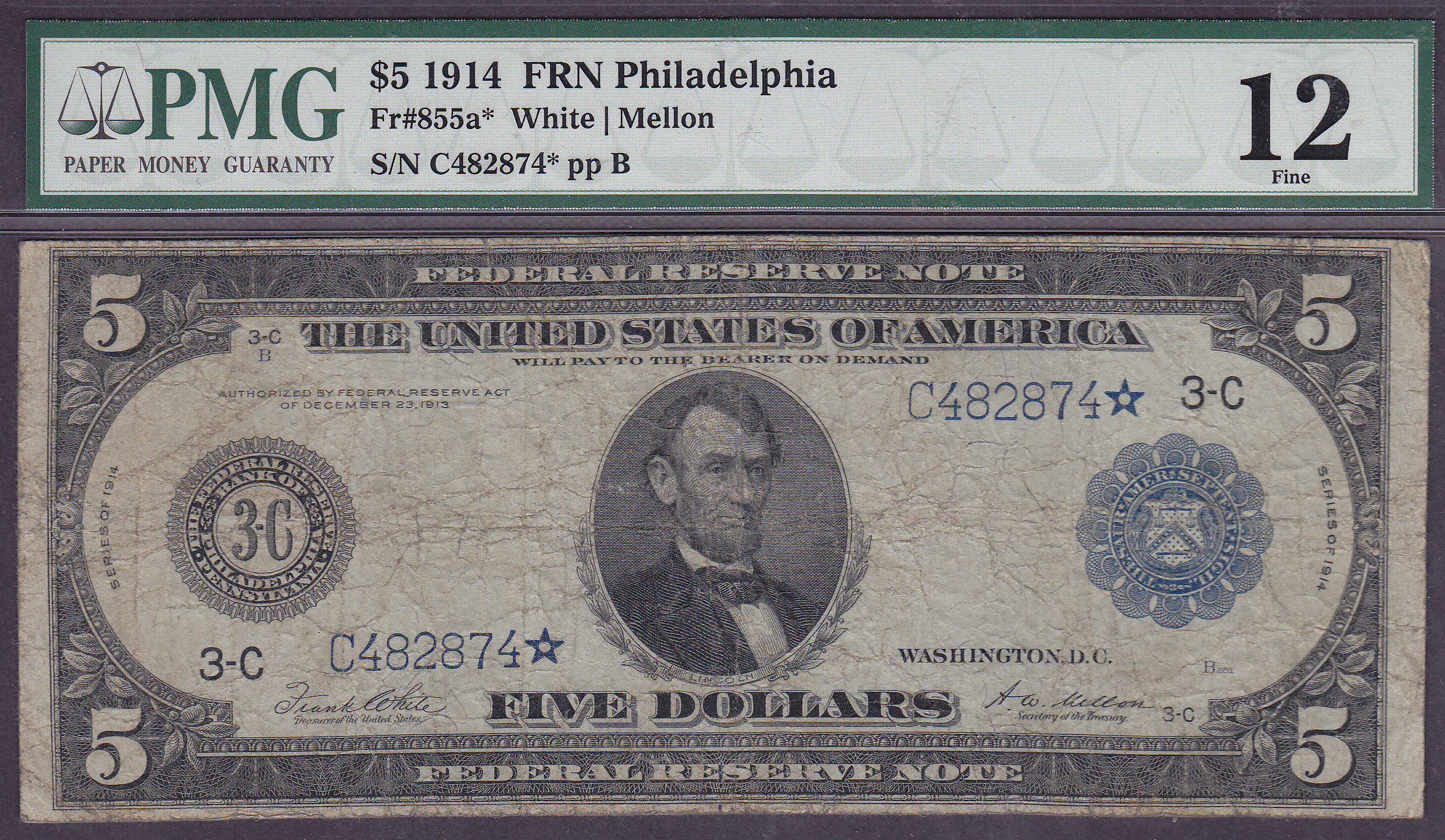 Fr.-855a* 1914 $5 FRN Star Ser. # C482874* PMG F-12