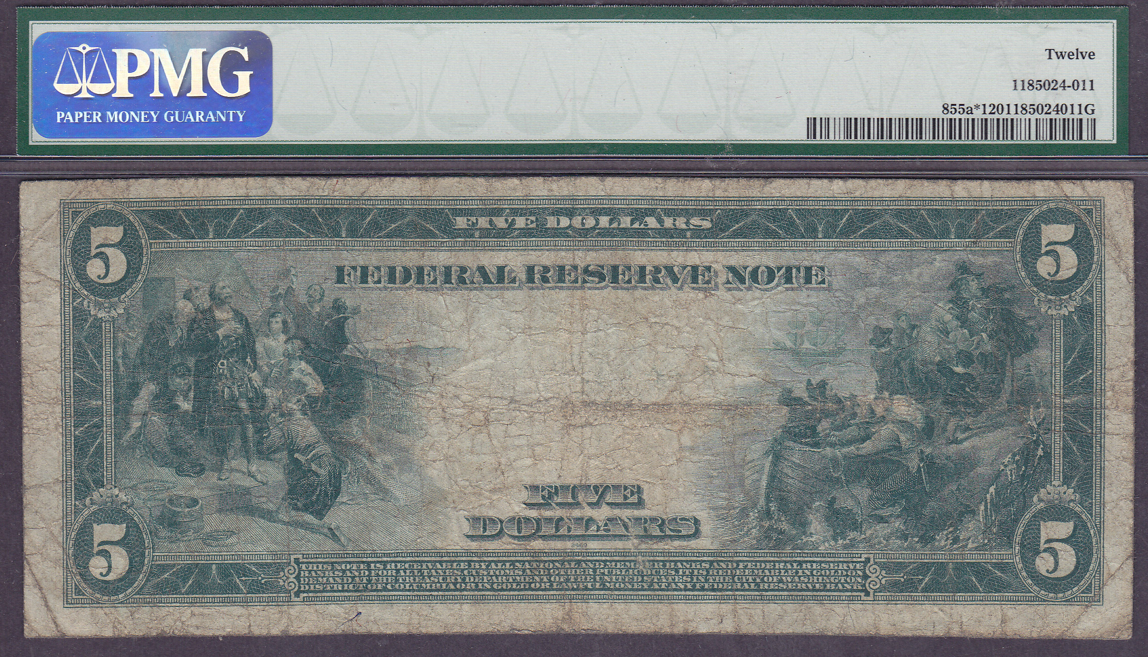 Here is your chance to own a large size star note for next to nothing. This is a circulated example of the 1914 $5 FRN star note. The serial number is C482874* and it hails from Philly.It is in a PMG F-12 holder.