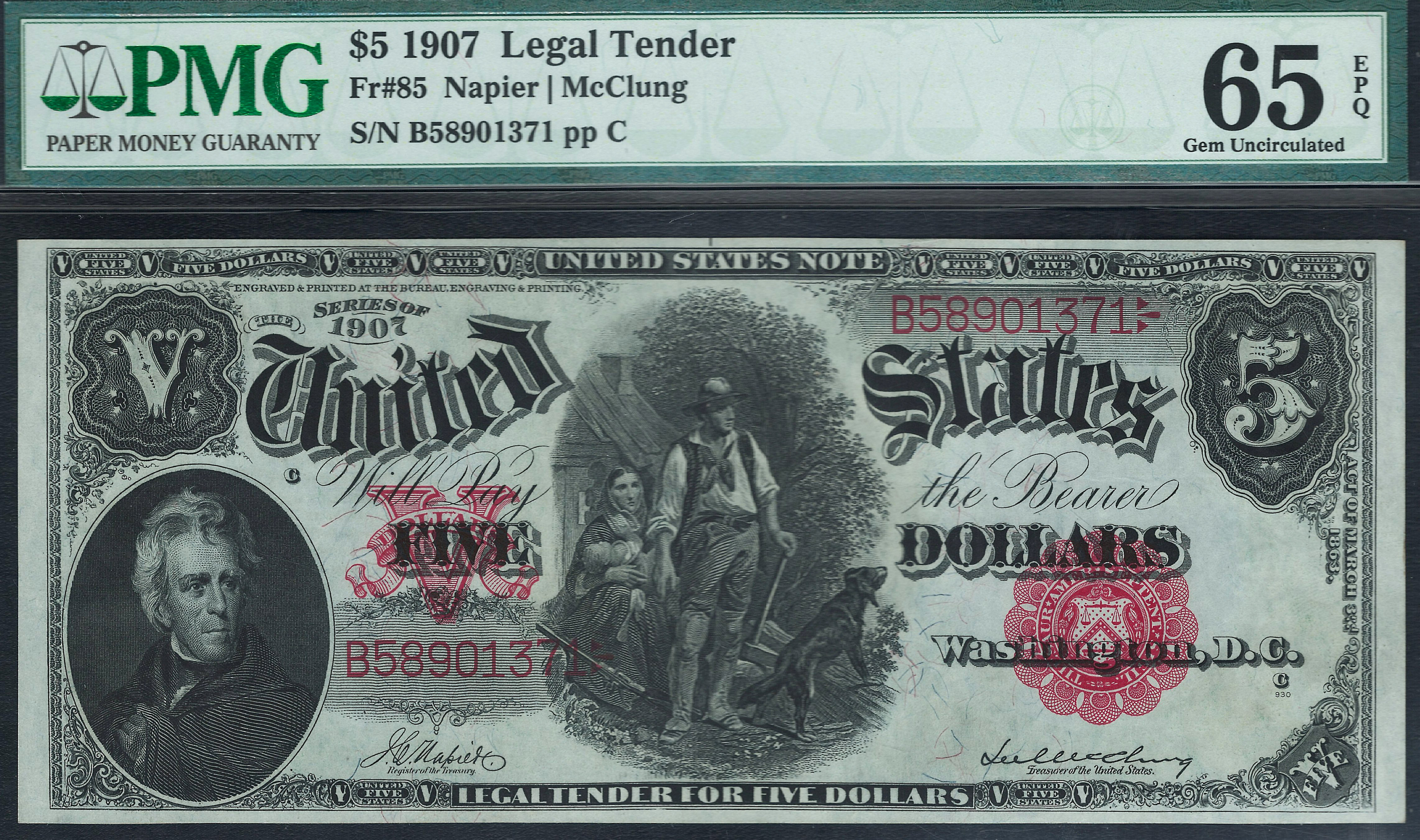 Fr.-85 1907 $5 Legal Tender Ser. B58901371 PMG 65 EPQ