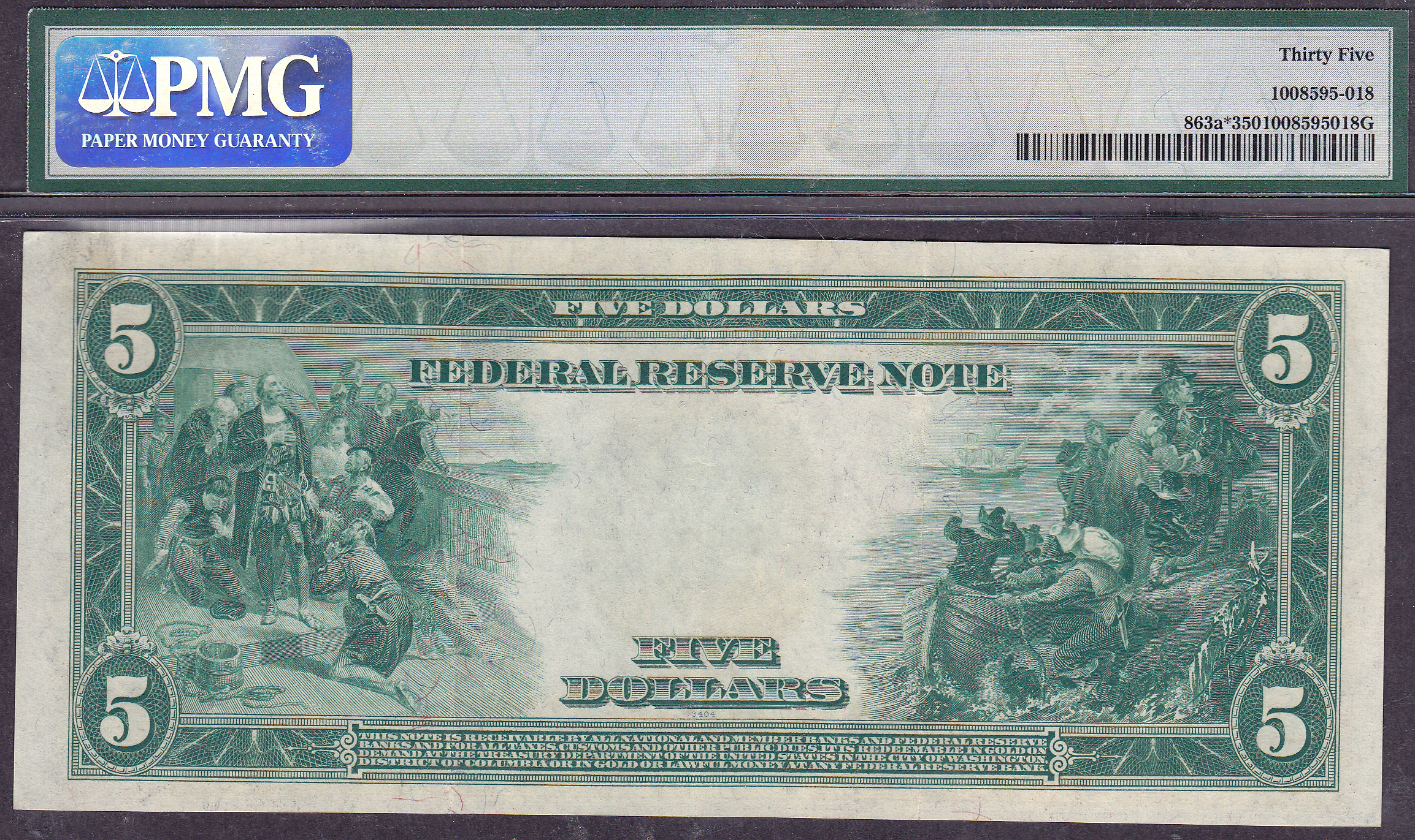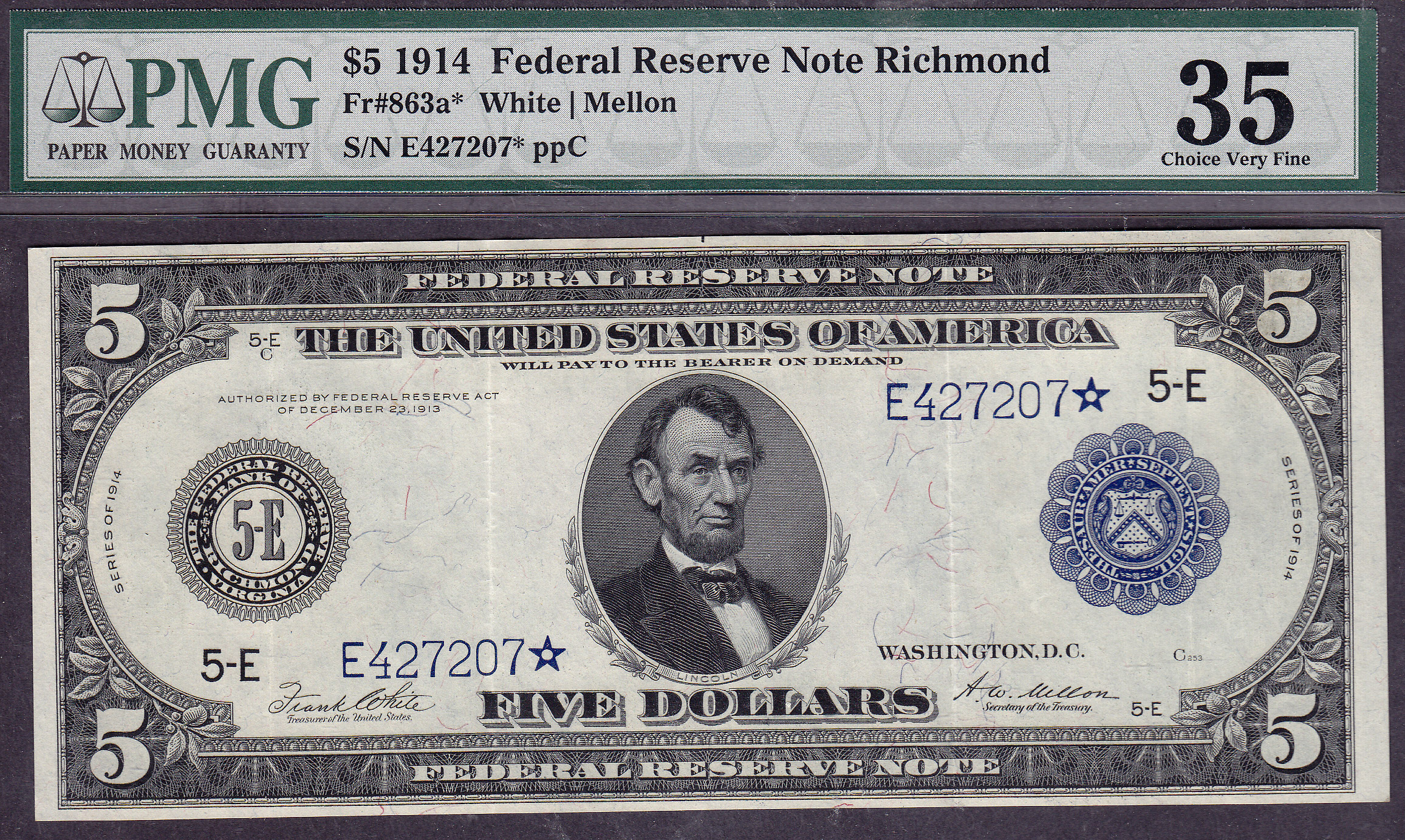 Fr.-863a* 1914 $5 FRN Star Ser. # E427207* PMG VF-35