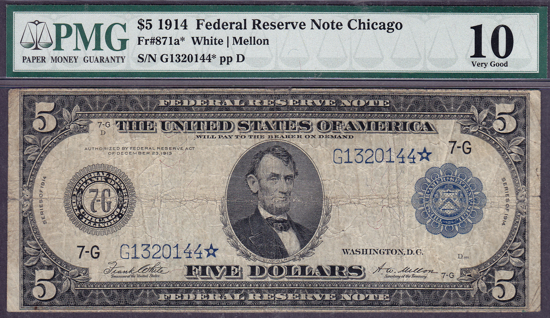 Fr.-871a* 1914 $5 Chicago FRN Star Ser. # G1320144* PMG VF-10
