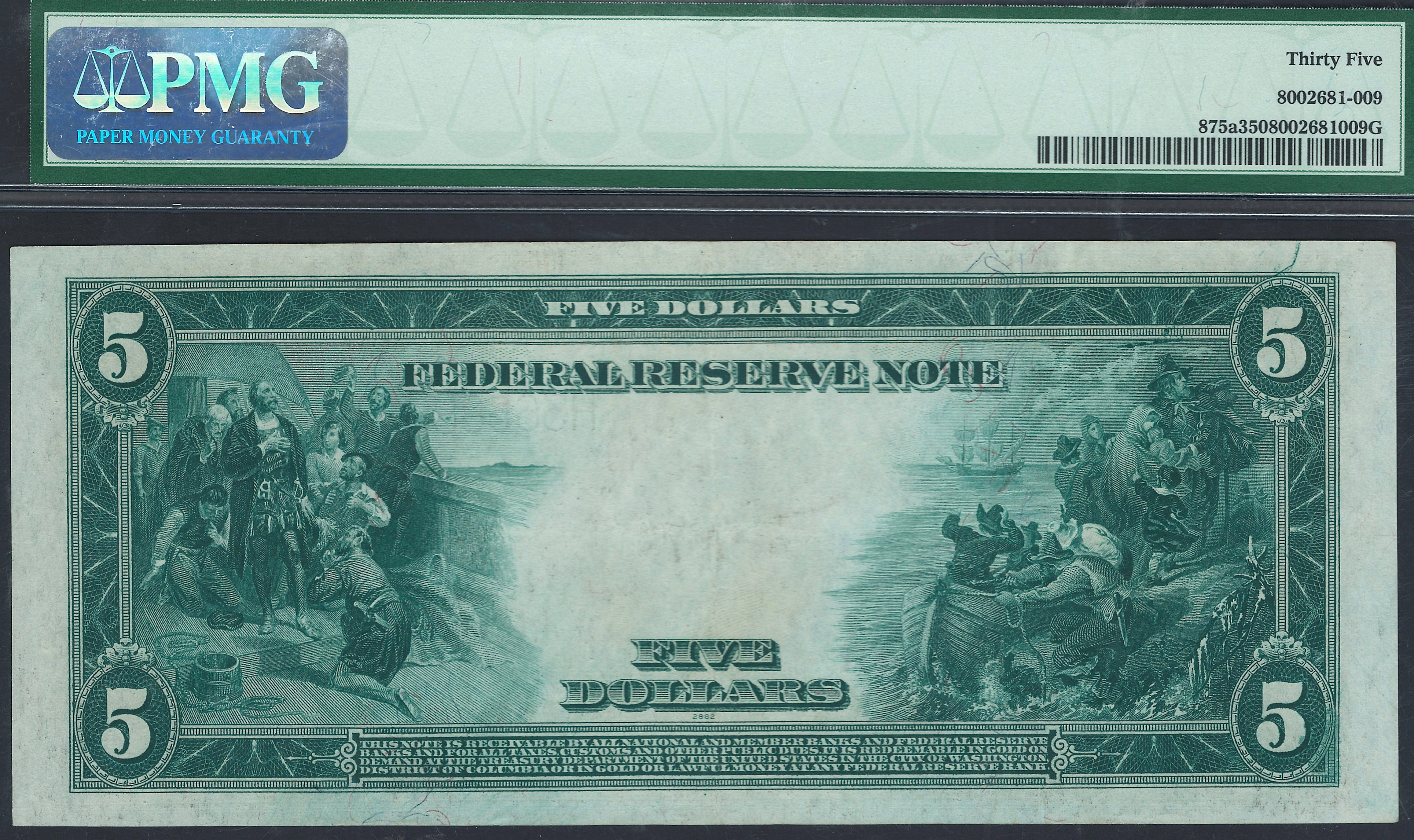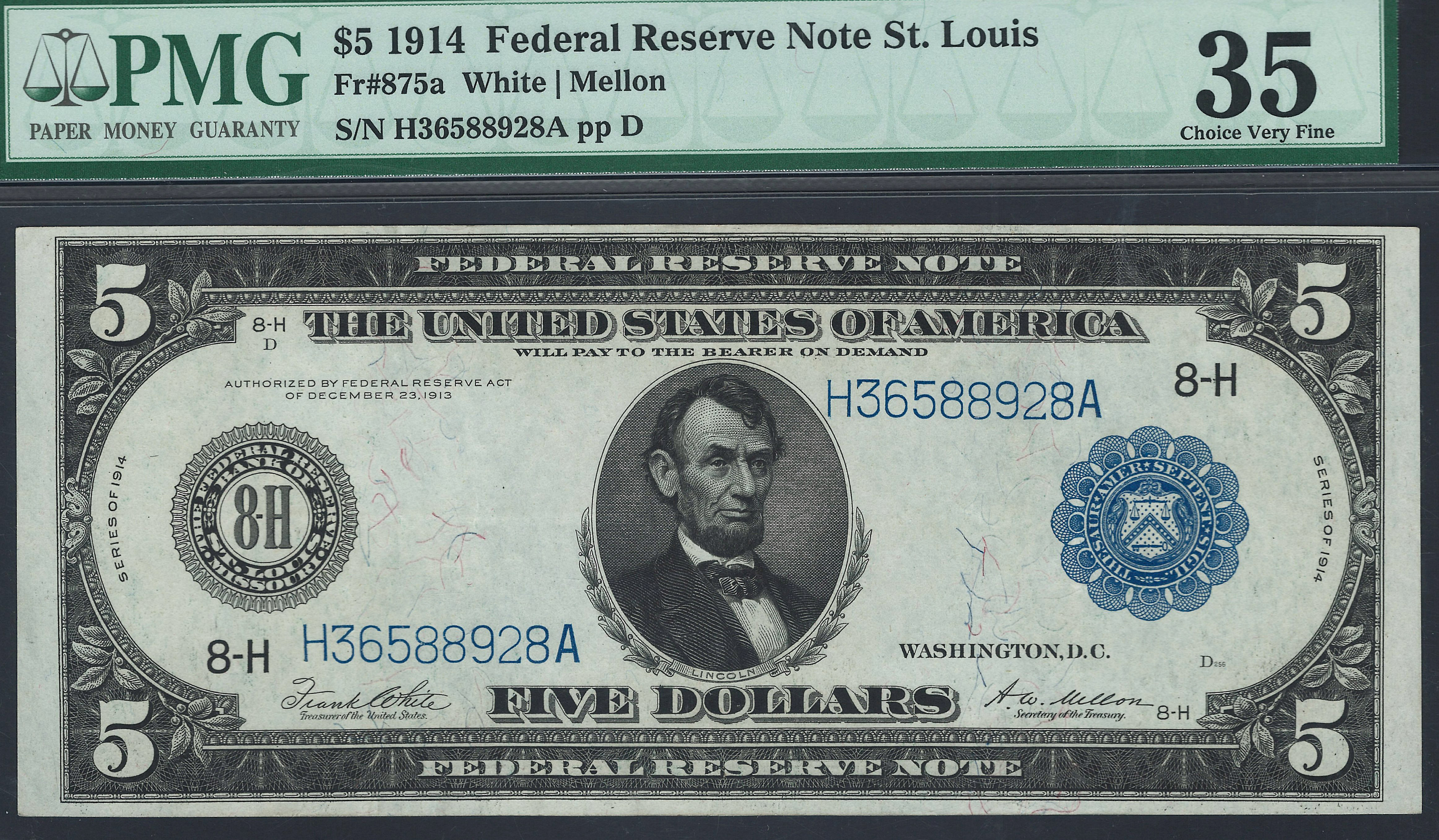 Here we have a problem free 1914 $5 Federal Reserve Note from the St. Louis district. On the obverse is featured the scalloped blue seal to the right with two sets of blue serial numbers. Abraham Lincoln is pictured in the center .On the reverse you will see a vignette of Columbus in sight of land and on the right you will see the vignette of the Landing of the Pilgrims. This note has no rips, tears, pinholes or bank stamps. The serial number is H36588928A and is in a PMG-VF35 holder.