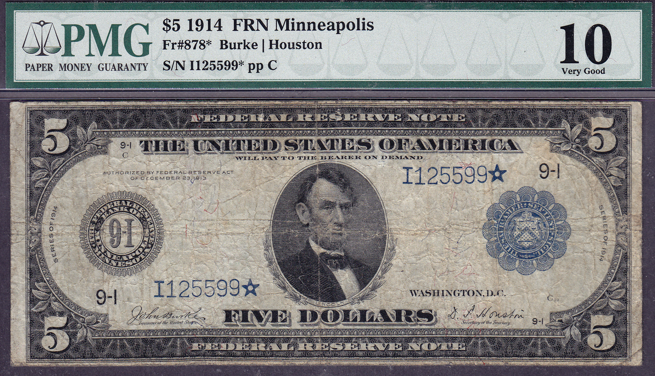 Fr.-878* 1914 $5 Minneapolis FRN Star ( 9 known ) Ser. # I125599* PMG VF-25
