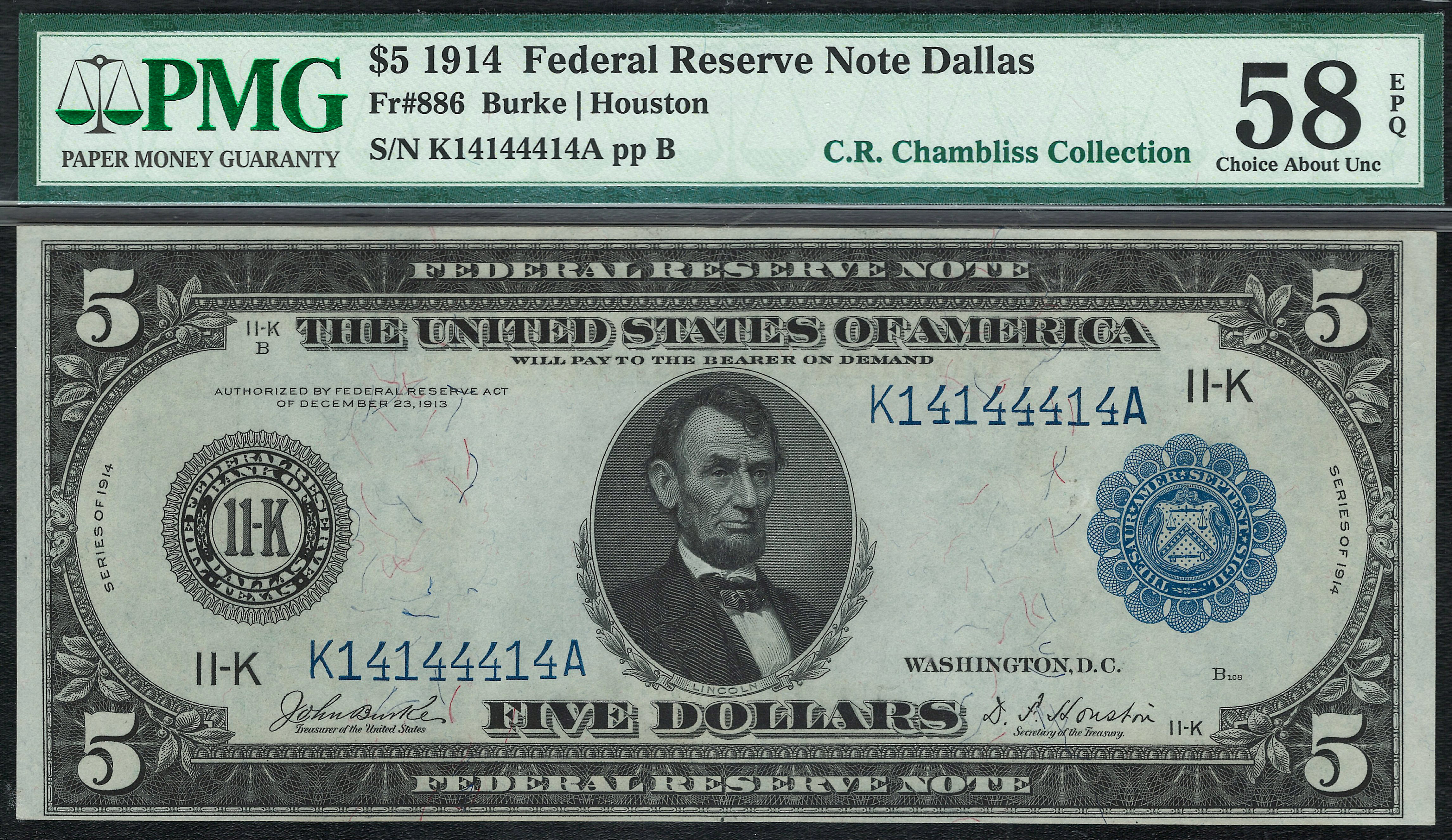 Fr.-886 1914 $5 Dallas FRN Ser. K14144414A PMG-58EPQ