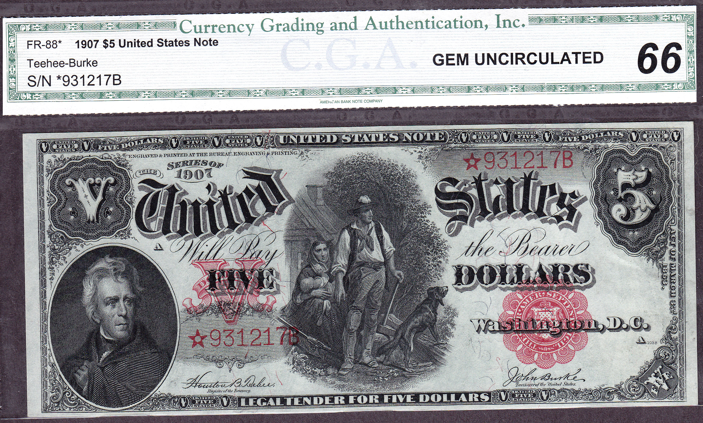 Fr.-88* 1907 $5 Legal Tender Star Ser. # 931217B* CGA GEM-66