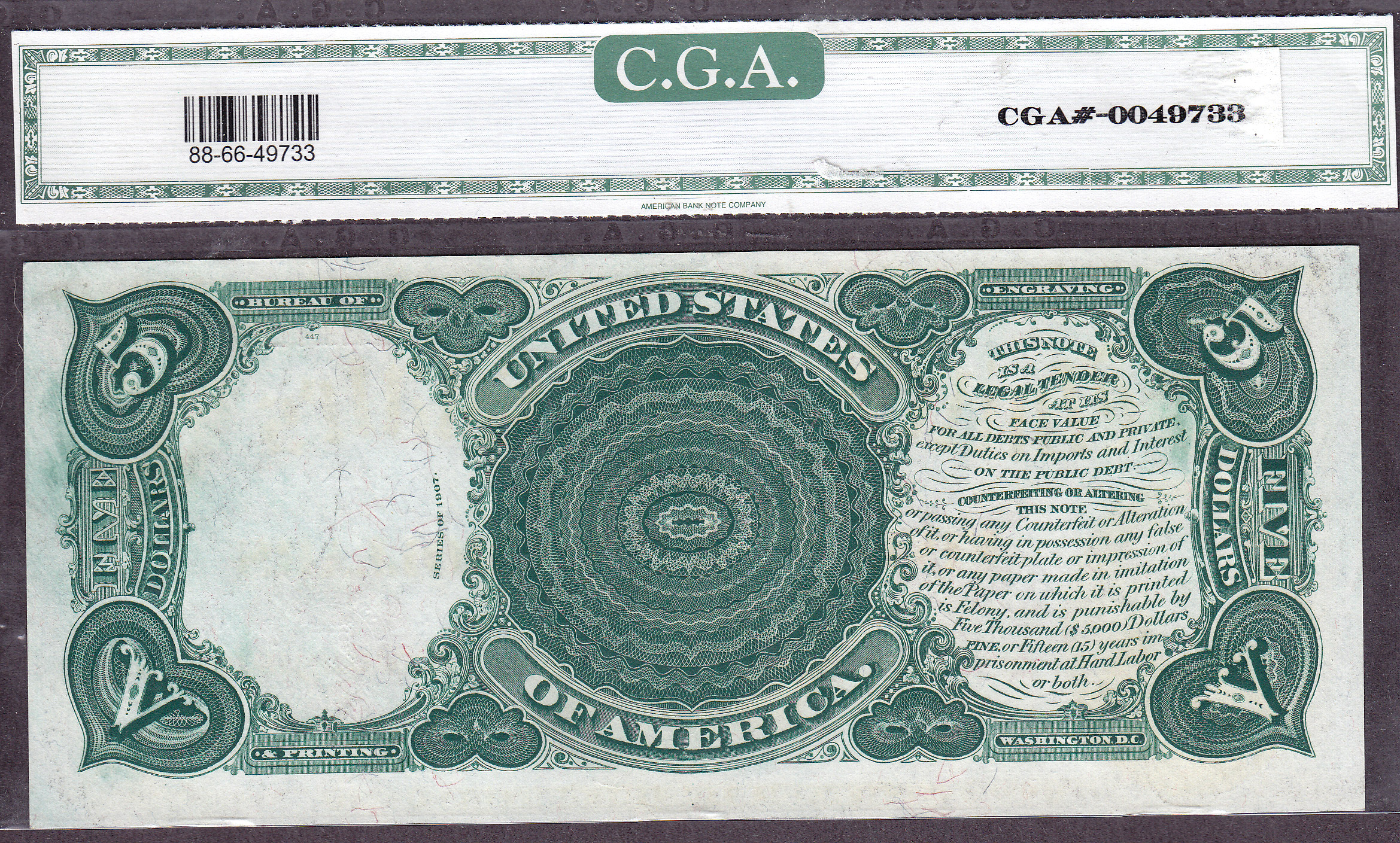 This is the finest 1907 $5 Legal Tender Star know to exist to date. There are only 4 UNC's known. Check the scans to verify what I just stated. Murrays Book of Large Size Star Notes lists this note at $5500 in UNC. I don't believe this note will cross over into a PMG or PCGS-66 grade as the back top margin is a bit off. I'm thinking a CHCU-64 or possibly a GEM-65 grade. However on a Plate # A note the top selvage is supposed to be smaller than the bottom as the Plate D note will have the opposite effect. It is what it is...the finest!