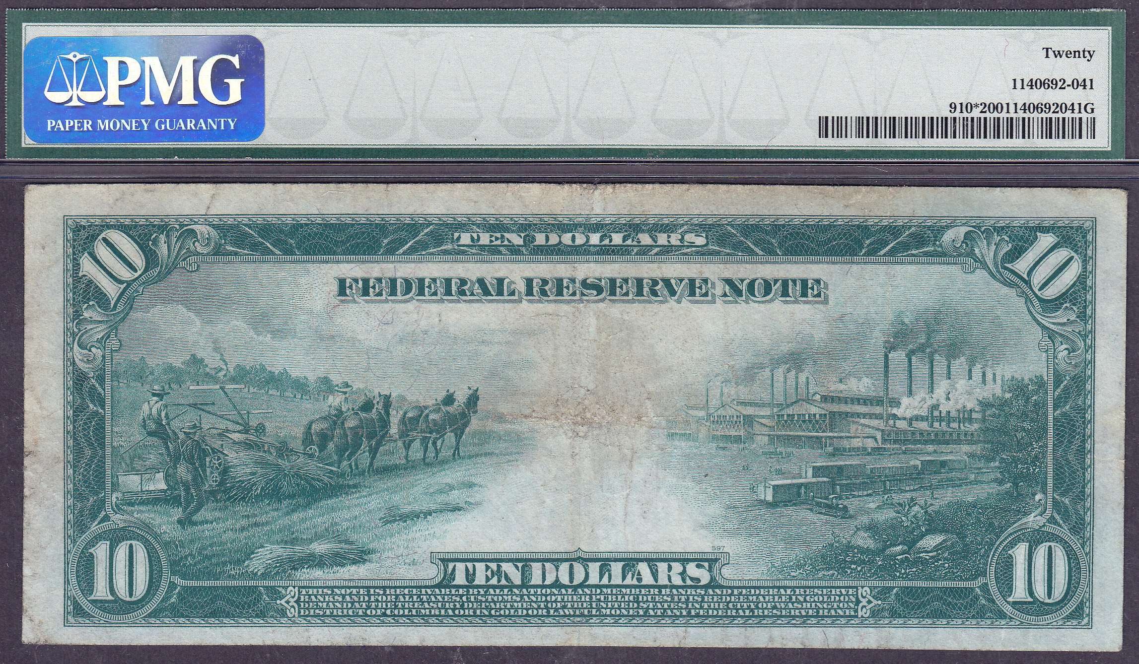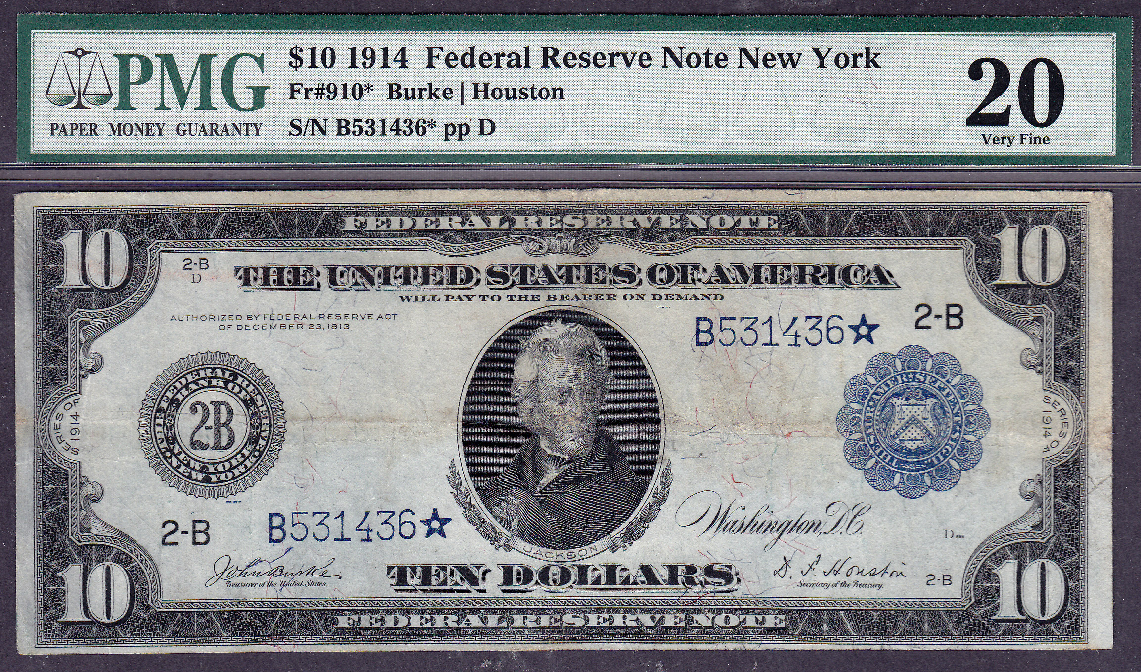 Fr.-910* 1914 $10 New York FRN Star Ser. # B531436* PMG VF-20