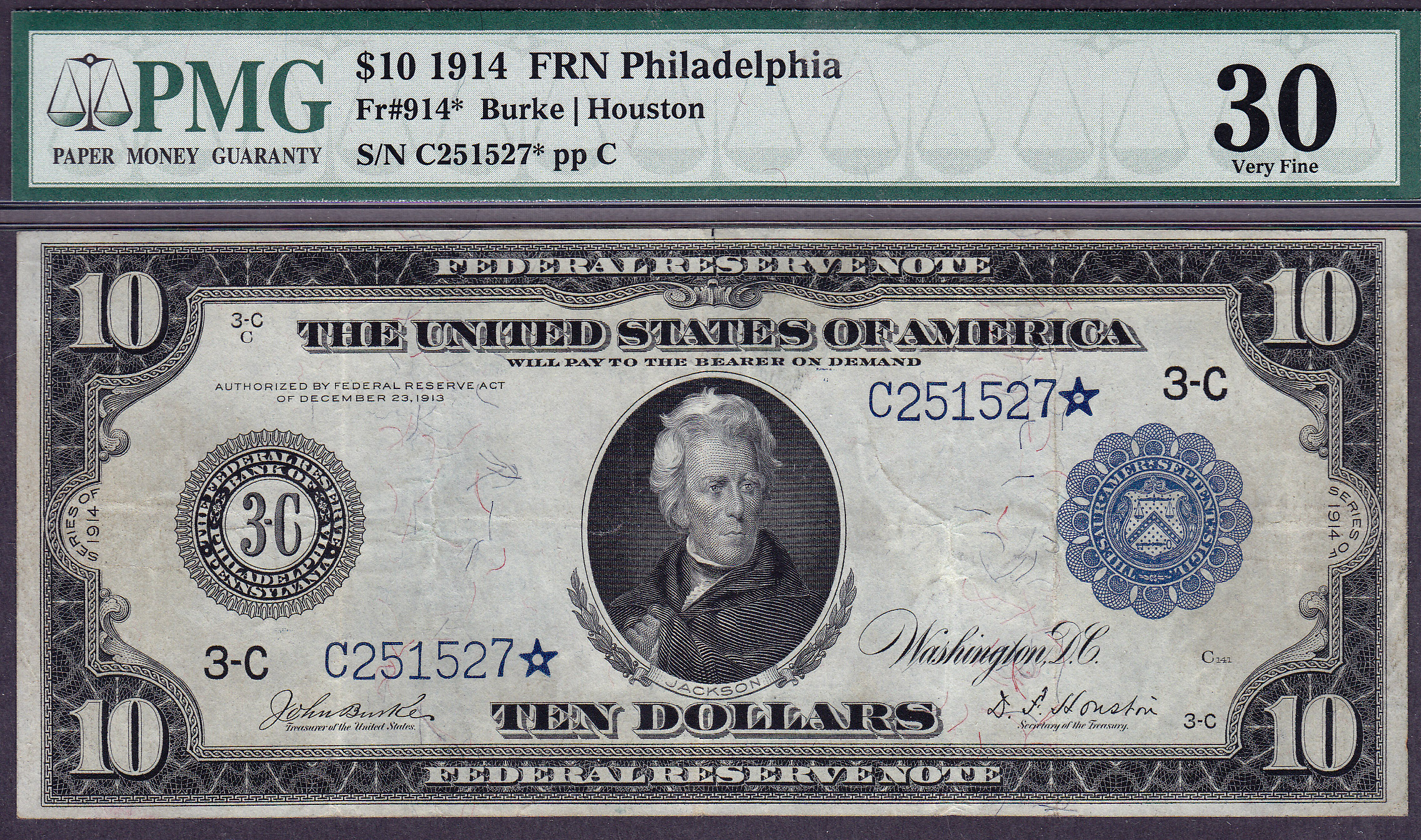 Fr.-914* 1914 $10 FRN Star (10 known) Ser. # C251527* PMG VF-30