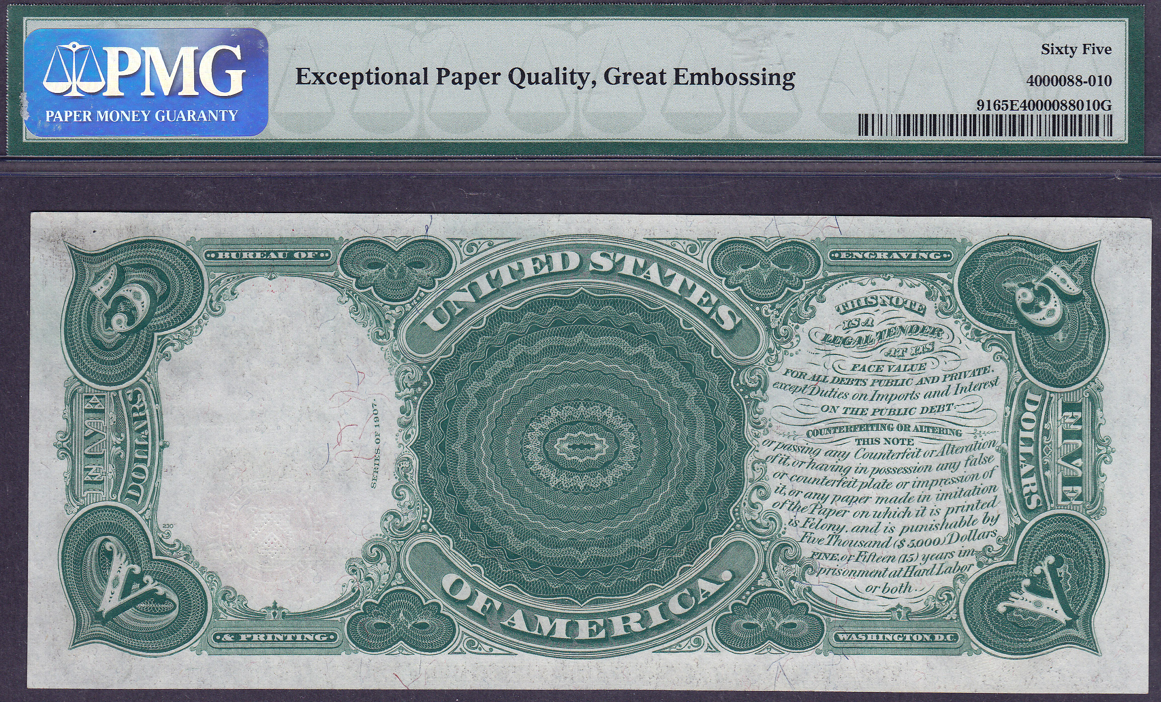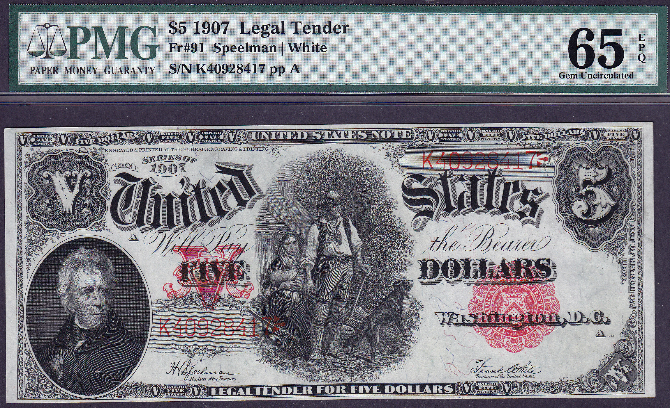 Fr.-91 1907 $5 Legal Tender Ser. # K40928417 PMG-65EPQ & GE