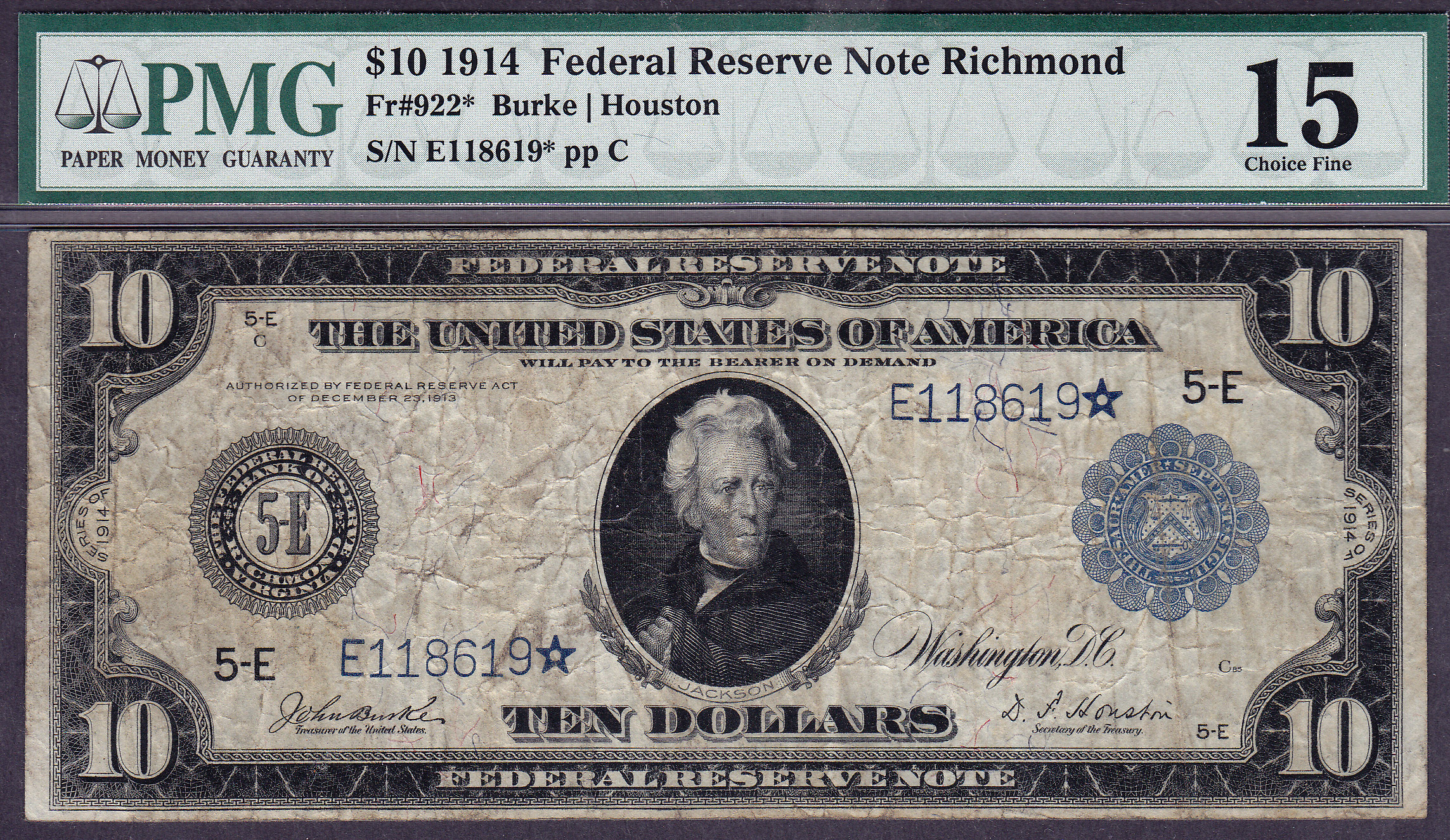 Fr.-922* 1914 $10 Richmond FRN Star (13 known) Ser. # E118619* PMG F-15