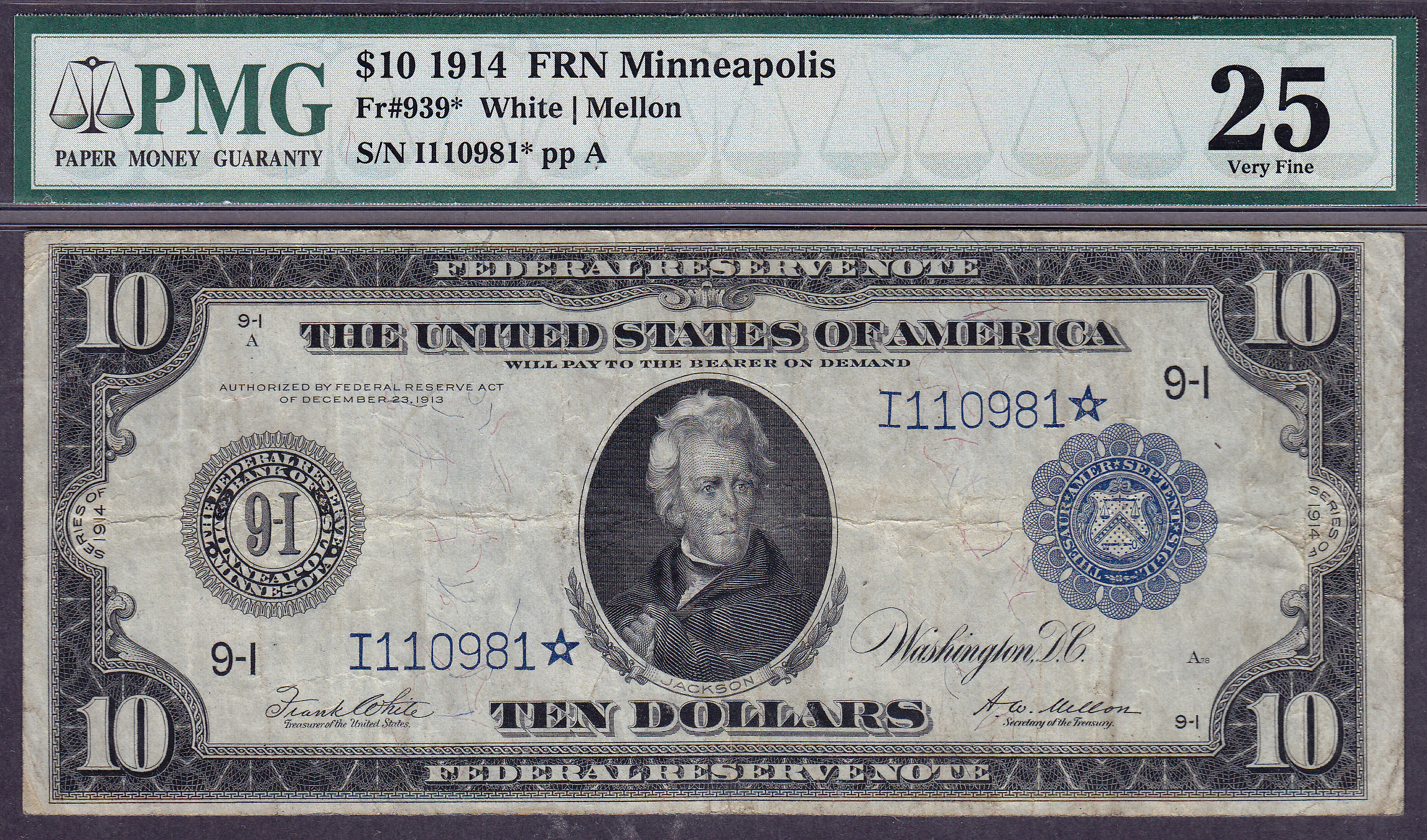 Fr.-939* 1914 $10 Minneapolis FRN Star (6 known) Ser. # I110981* PMG VF-25