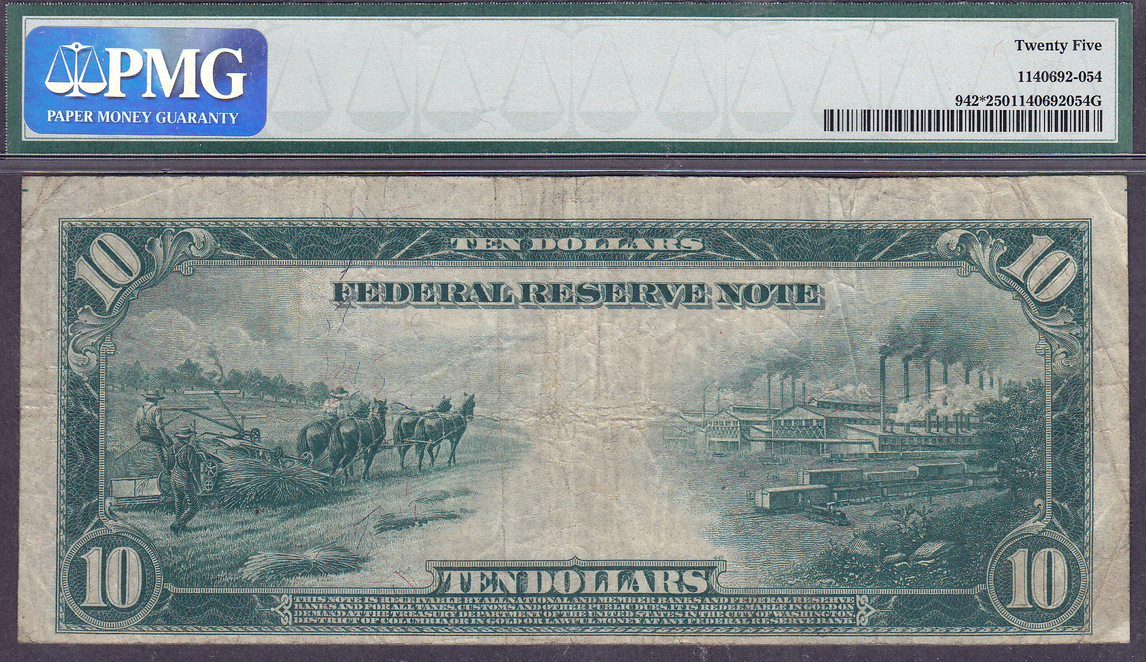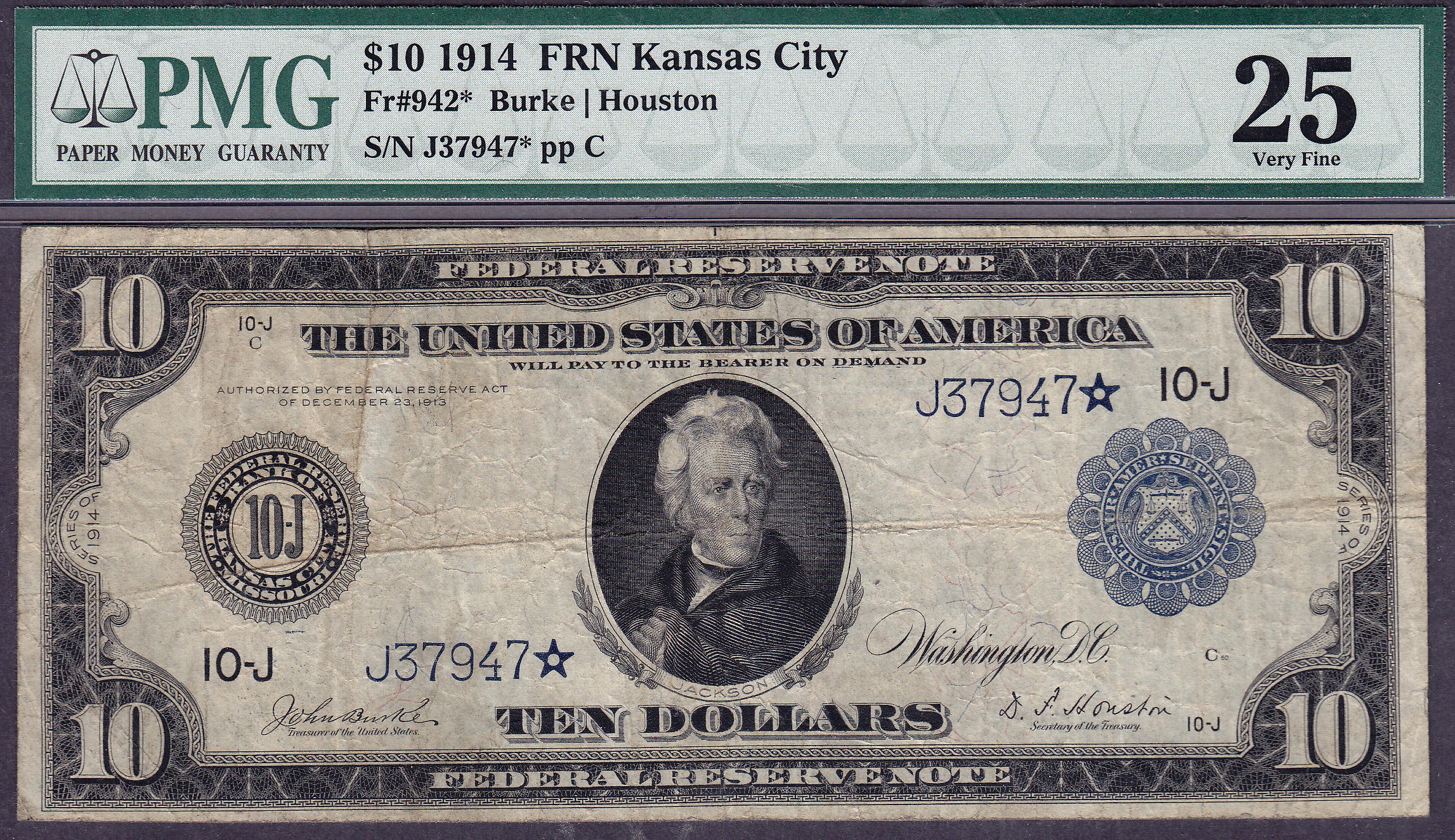 This is a very nice PMG VF-25 1914 $10 FRN star note from the Kansas City district. There are 12 known. The serial number is J37947*.