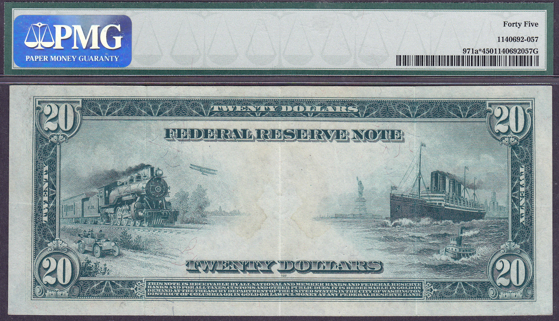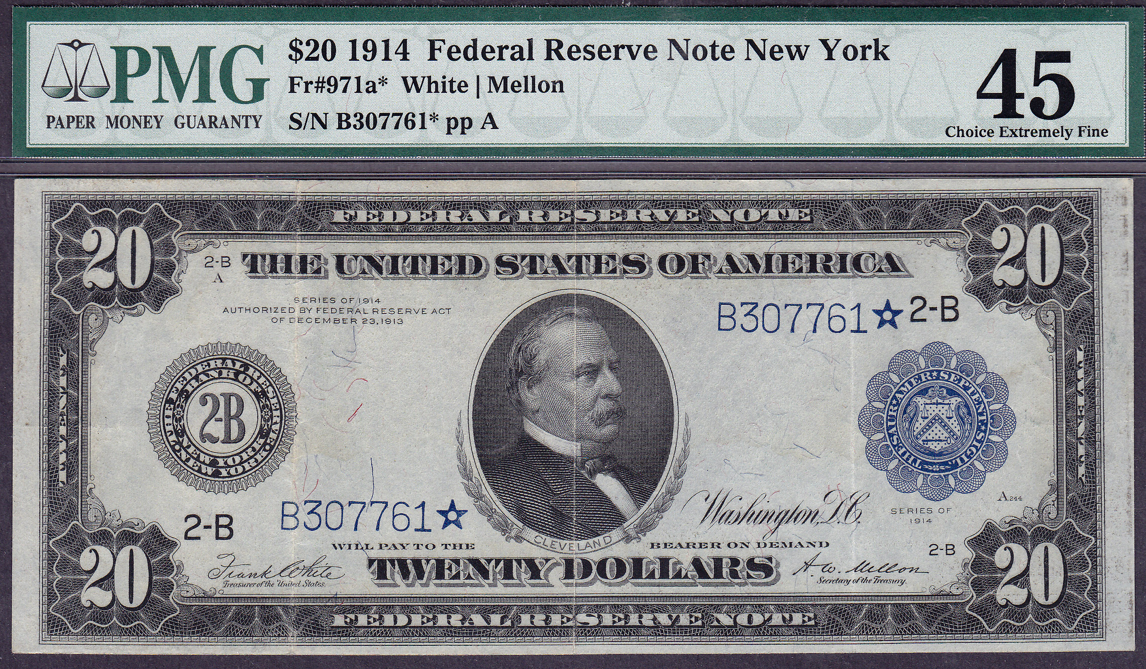 Here is a very nice 1914 $20 FRN from New York. it has been graded as a PMG EF-45. Kelly books this rare star note at $1400.