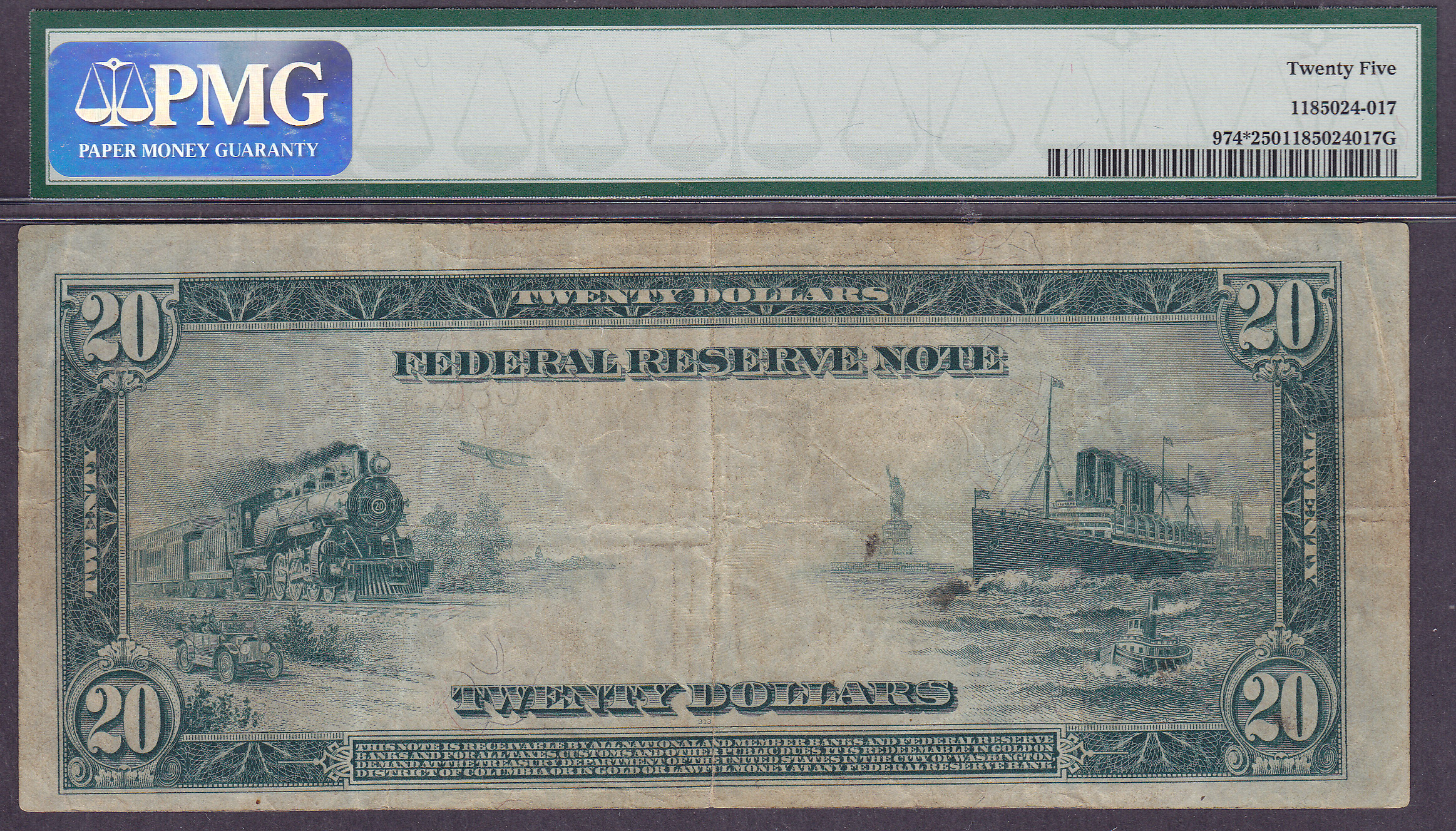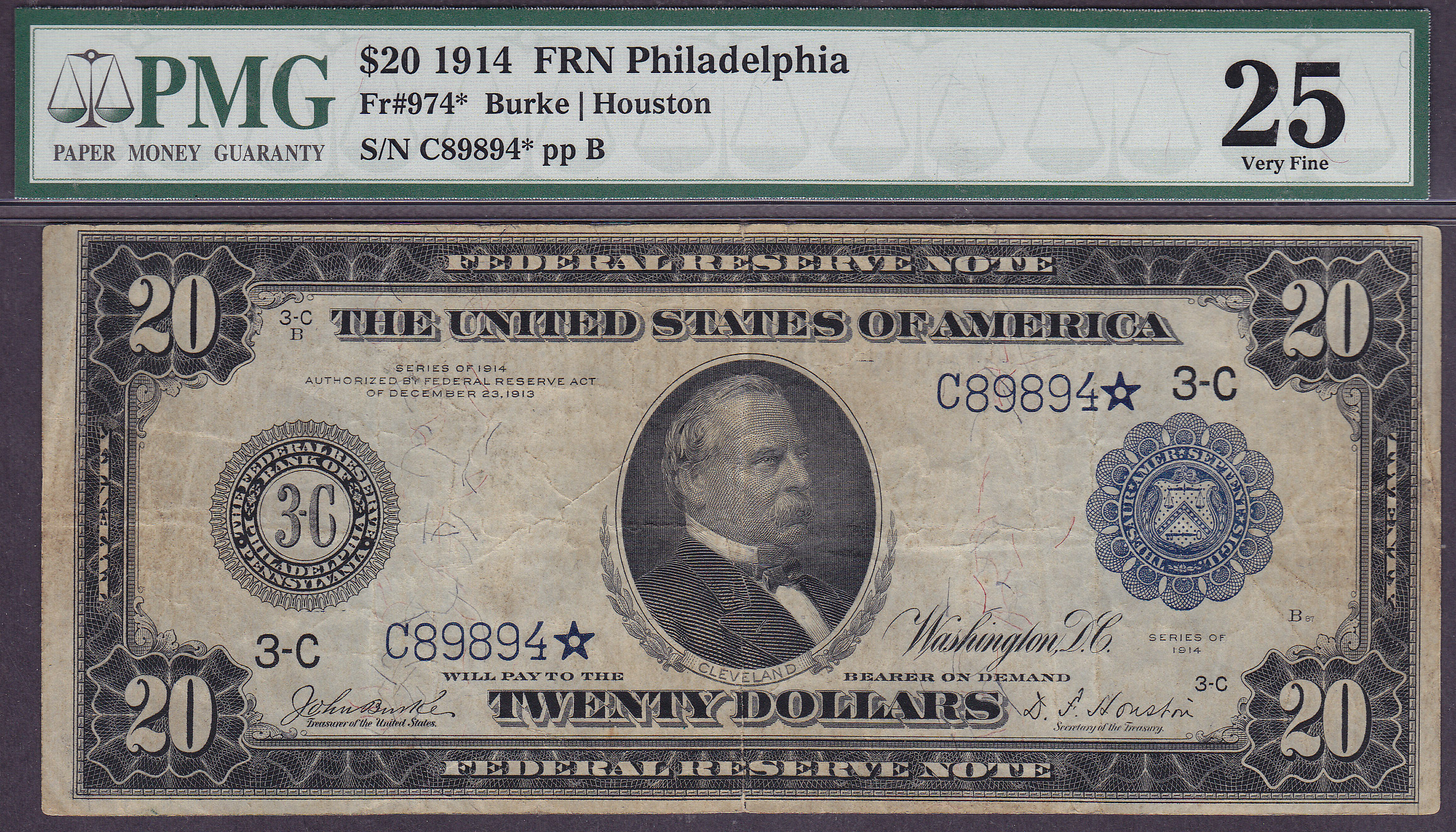 Here we have a FR-974* which is a 1914 $20 FRN from the Philly district in a PMG VF-25 holder. There are only 15 known according to Doug Murrays book. Check out the large scans.