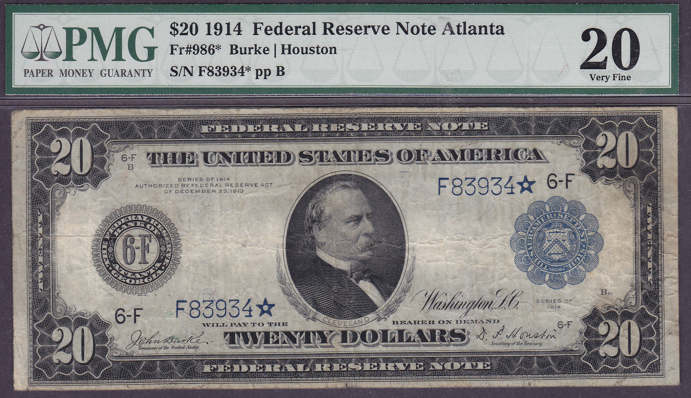 Here is another rare 1914 $20 FRN, FR-986* from the Atlanta district. There are only five known according to the Murry Book. The serail number is F83934*. Check out the large scans.